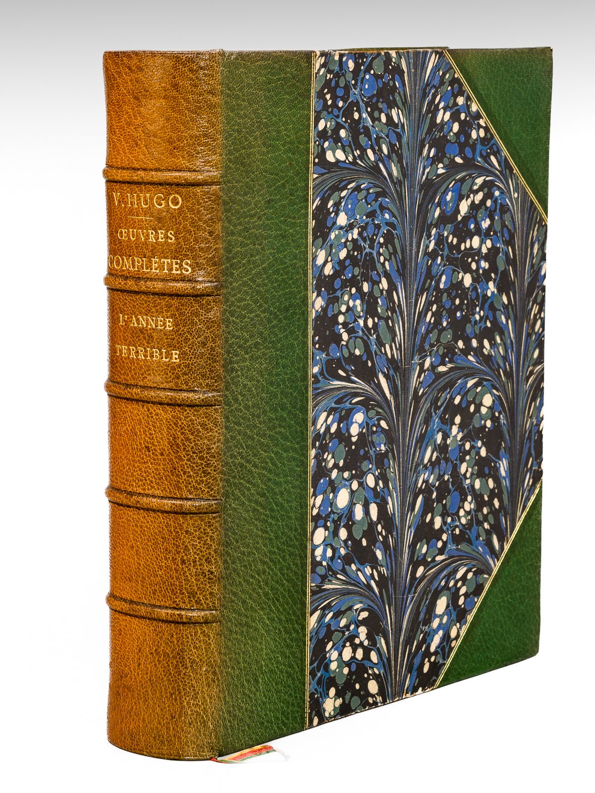 1 vol. fort in-4 reliure de l'époque demi-maroquin à coins vert, dos à 5 nerfs, double filet doré en mors et coins, tranche sup. dorée et finement ciselée, couverture conservée, Edition Nationale, Emile Testard, Paris, 1888, 2 ff., 425 pp. avec 5 planches hors texte (eaux-fortes) avec vignettes dans le texte Belle édition de "L'Année Terrible" appartenant à la célèbre "Edition Nationale", établie dans une reliure de qualité en demi-maroquin à coins. La tranche supérieure est admirablement ciselée et finement dorée. Bon état (dos passé, très bon état par ailleurs). Vicaire, IV, 423