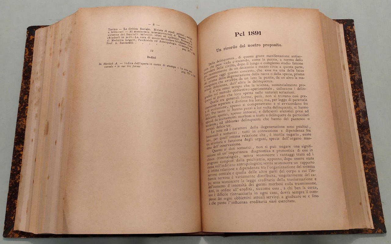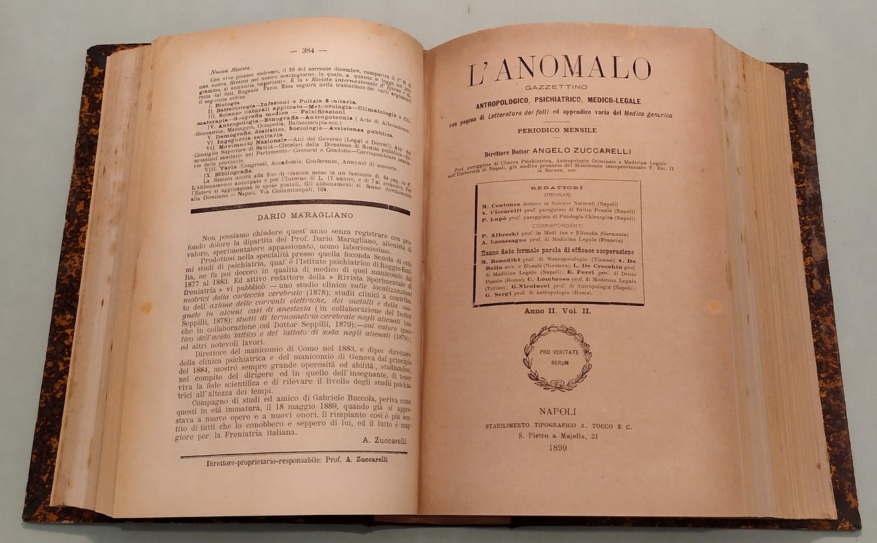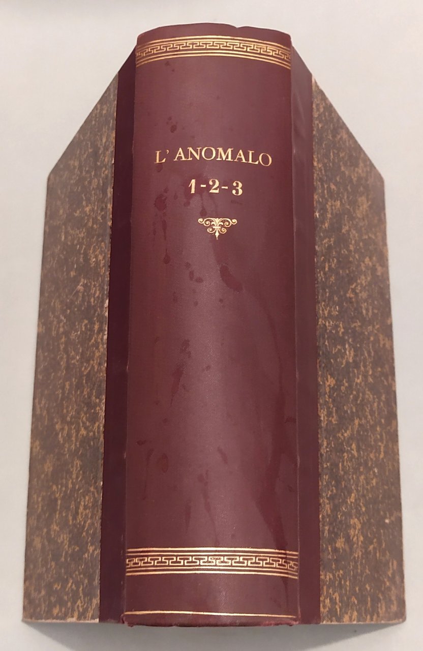 L'ANOMALO. Gazzettino antropologico, psichiatrico, medico-legale con pagina di Letteratura dei folli ed appendice varia del medico generico. Periodico mensile. Direttore A.Zuccarelli. Napoli, Pesole-Tocco, 1889-1890-1891. Tre parti in un volume in 8vo; pp.384; 384, 8; 392. Mezza pelle, titolo in oro al dorso. L'Anomalo si pubblicò a Napoli dal 1889 al 1922. "Angelo Zuccarelli, alienista e criminologo napoletano di formazione lombrosiana, già medico primario del manicomio interprovinciale di Nocera, fu fondatore e direttore nel 1893 del gabinetto-scuola con annesso museo di antropologia criminale presso l'Università di Napoli, dove insegna dal 1887 e pubblica dal 1890 L'Anomalo, rivista di antropologia criminale, psichiatria e medicina legale. Zuccarelli è anche il più instancabile e coerente promotore in Italia della "sterilizzazione della donna per limitare la riproduzione dei maggiormente degenerati". Il programma di Zuccarelli comprende tutta la serie di punti in seguito richiamati dagli esperti della rigenerazione biologica dell'umanità. Si parte dalla lotta contro la miseria e l'ingiustizia per arrivare a "regolare con leggi provvide a base scientifica il matrimonio; proibire i matrimoni tra consaguinei; proibire i matrimoni tra individui di troppo dispari età; escludere recisamente dalla riproduzione i più degenerati; rendere solubili i vincoli di matrimoni male assortiti, infelici; fare una sollecita ricognizione degli avariati fin dalle scuole, annotarli, seguirli nei pubblici uffici, coglierli e provvedere a loro opportunamente alle prime manifestazioni morbose e criminali; semplificare e metodizzare meglio l'istruzione". (Claudia Mantovani, Rigenerare la società, pp.52-53)