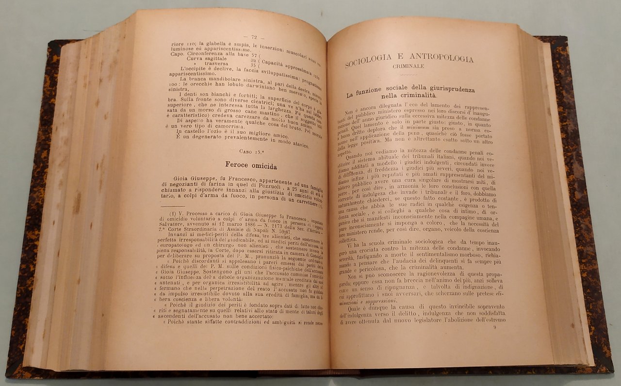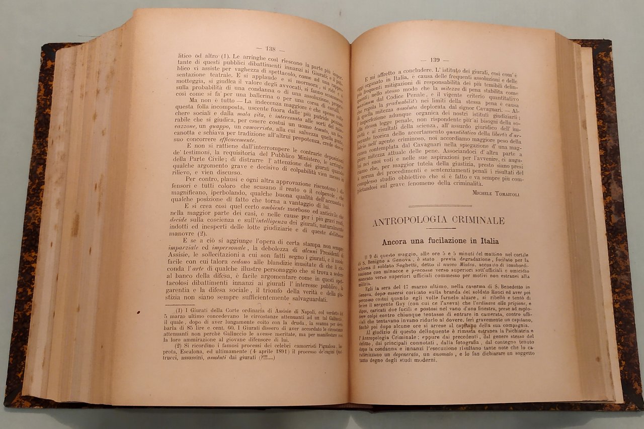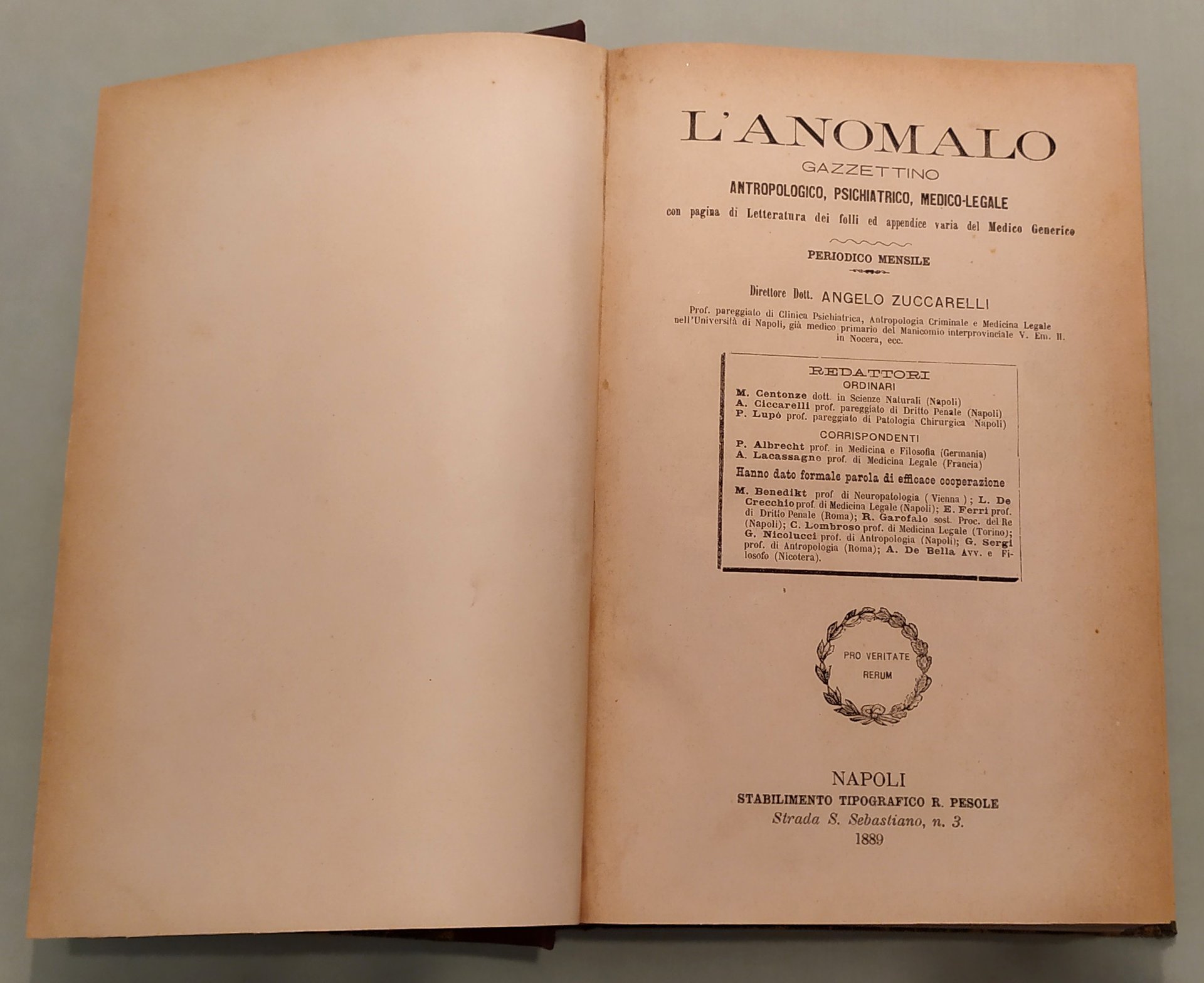 L'ANOMALO. Gazzettino antropologico, psichiatrico, medico-legale con pagina di Letteratura dei folli ed appendice varia del medico generico. Periodico mensile. Direttore A.Zuccarelli. Napoli, Pesole-Tocco, 1889-1890-1891. Tre parti in un volume in 8vo; pp.384; 384, 8; 392. Mezza pelle, titolo in oro al dorso. L'Anomalo si pubblicò a Napoli dal 1889 al 1922. "Angelo Zuccarelli, alienista e criminologo napoletano di formazione lombrosiana, già medico primario del manicomio interprovinciale di Nocera, fu fondatore e direttore nel 1893 del gabinetto-scuola con annesso museo di antropologia criminale presso l'Università di Napoli, dove insegna dal 1887 e pubblica dal 1890 L'Anomalo, rivista di antropologia criminale, psichiatria e medicina legale. Zuccarelli è anche il più instancabile e coerente promotore in Italia della "sterilizzazione della donna per limitare la riproduzione dei maggiormente degenerati". Il programma di Zuccarelli comprende tutta la serie di punti in seguito richiamati dagli esperti della rigenerazione biologica dell'umanità. Si parte dalla lotta contro la miseria e l'ingiustizia per arrivare a "regolare con leggi provvide a base scientifica il matrimonio; proibire i matrimoni tra consaguinei; proibire i matrimoni tra individui di troppo dispari età; escludere recisamente dalla riproduzione i più degenerati; rendere solubili i vincoli di matrimoni male assortiti, infelici; fare una sollecita ricognizione degli avariati fin dalle scuole, annotarli, seguirli nei pubblici uffici, coglierli e provvedere a loro opportunamente alle prime manifestazioni morbose e criminali; semplificare e metodizzare meglio l'istruzione". (Claudia Mantovani, Rigenerare la società, pp.52-53)