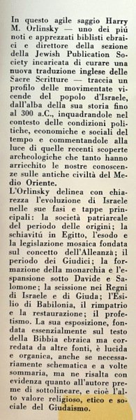 In questo agile saggio Harry M. Orlinsky - uno dei più noti e apprezzati biblisti ebraici e direttore della sezione della Jewish Publication Society incaricata di curare una nuova traduzione inglese delle Sacre Scritture - traccia un profilo delle movimentate vicende del popolo d'Israele, dall'alba della sua storia fino al 300 a.C., inquadrandole nel contesto delle condizioni politiche, economiche e sociali del tempo e commentandole alla luce di quelle recenti scoperte archeologiche che tanto hanno arricchito le nostre conoscenze sulle antiche civiltà del Medio Oriente.
