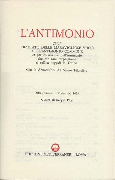 L'antimonio. Cioè trattato delle meravigliose virtù dell'antimonio commune et particolarmente dell'antimonio che con rara preparatione si raffina hoggidì in Torino. Con le annotazioni del signor Filostibio. A cura di Sergio Tira.