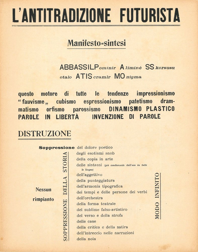 MANIFESTOPrima edizione italiana.Ottimo esemplare.Fondamentale manifesto parolibero elaborato da Apollinaire ed editato da Marinetti. «Datato “Parigi, il 29 Giugno 1913, giorno del Grand Prix, a 65 metri al disopra di Boulevard S.-Germain”, il manifesto fu lanciato in forma di volantino dalla direzione del movimento futurista, in italiano e francese, e pubblicato il 3 agosto sul giornale parigino “Gil Blas”, poi in italiano su “Lacerba” (I.18, 15 settembre 1913). Il proclama, che offriva in omaggio “rose” ai protagonisti dell’avanguardia e “merde” ai passatisti, non solo ha segnato l’avvio della fase sincretistica e transnazionale dell’avanguardia, ma è servito anche da modello per quegli artisti d’avanguardia che avrebbero lanciato manifesti: dai vorticisti britannici ai futuristi portoghesi, fino al più tardo “Manifesto antiartistico catalano” firmato da Salvador Dalì. Stando però ai ricordi di Carlo Carrà, era stato Marinetti a conferire al manifesto l’eccellente forma grafica, poi approvata da Apollinaire: “Marinetti lesse il manoscritto con grande entusiasmo e dopo una breve pausa soggiunse: le idee espresse sono molto interessanti, ma occorre dare al manoscritto la forma del manifesto; e afferrato un grande foglio di carta trascrisse le parole di Apollinaire, soffermandosi sugli spazi com’era in uso dai precedenti manifesti. Fatta qualche piccola modifica su alcune parole, e andando i tipografia, raccomandando l’urgenza, il giorno seguente verso sera arrivò la bozza del manifesto che fu subito spedita a Parigi ad Apollinaire. Dopo tre o quattro giorni arrivò il benestare dell’autore, contentissimo della forma tipografica data da Marinetti al suo scritto”» (Salaris).Bibl.: Tonini, I manifesti, 60.2; Salaris, Futurismi nel mondo, pp. 376-383
