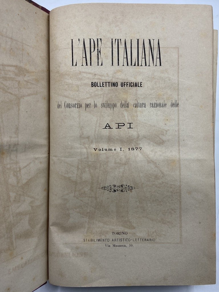 Un volume in mezza pelle rossa con titoli dorati sul dorso liscio e piatti marmorizzati, in ottavo cm 23x16, pp (4) 244, 228; alcune figure e tavole in nero, frontespizio figurato per la seconda annata. Buono stato. Prime due annate del bollettino della società di apicoltura razionale fondata a Torino nel 1876; il bollettino ebbe da principio cadenza quindicinale (primi 6 fascicoli) per diventare mensile, portando il numero delle pagine da 8 a 16, a partire da aprile 1877. Fondato da Giovanni Molina, che lo diresse fino ad agosto 1877 quando gli succedette G. Pezzi, il periodico raccoglieva articoli di aggiornamento tecnico, notizie sulle normative e innovazioni del settore, segnalazioni bibliografiche, lettere dei soci, resoconti da esposizioni e congressi apistici, Statuto e atti del Consorzio, testi di conferenze. La prima annata è illustrata da 20 figure nel testo, la seconda da 57 distribuite fra il testo e le 8 tavole (di queste, quella in litografia, doppia, con l'illustrazione dello Smielatore Crema-Buscaglione era allegata al frontespizio del volume primo, su cui ha lasciato una sorta di ombra, ed è legata in calce all'annata 1877).