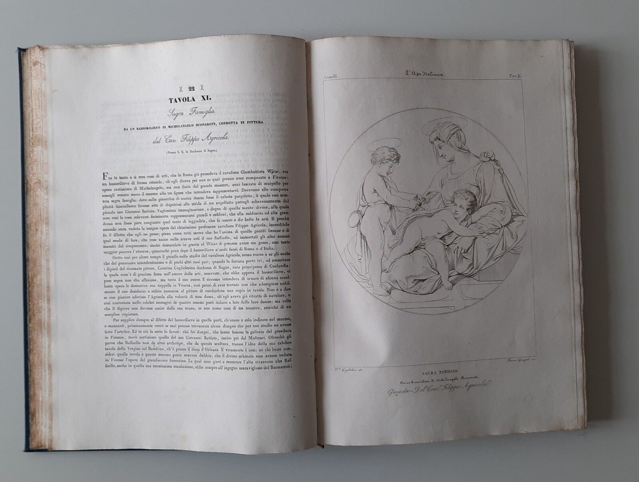 L'APE ITALIANA DELLE BELLE ARTI VOL. 3 - 4 ROMA TIP. C. PUCCINELLI 1838 - 1839In folio, pag. 65 di testo 36 tavole incise alcune ripiegate + 61 pagine di testo e 35 tavole incise, legatura in mezza pelle con titolo in oro al dorso.Abrasioni al dorso, pagine fresche e pulite.Ulteriori dettagli e immagini a richiesta.