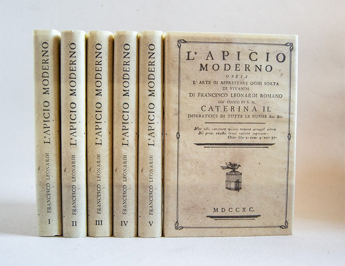 Leg. edit. Con sovraccoperta illustrata. 6 voll. LVIII, 259 pp.; LXX, 248 pp.; 350 pp.; 327; (1), 325 pp; (4), 325 pp. Tiratura di 500 copie numerate. Dall'introduzione: "Con la stampa dell'Apicio Moderno nel 1790, Leonardi sfida i francesi sul loro stesso terreno e rivela che in ogni città europea è possibile fornire una tavola principesca, superando i modelli e inventando nuovi piatti. È infatti ai cuochi delle corti e delle case italiane che l'opera si indirizza, per aggiornarli nella loro lingua, per permettere loro di operare facilmente in Europa. Vero Maestro, Leonardi appronta uno strumento ad un tempo sistematico e agevole. Dimosstra un profondo interesse per tutto quanto concerne l'alimentazione al di là del mestiere di cuoco. Il cosmopolitismo di Leonardi, la sua conoscenza a tutto campo degli alimenti solidi e liquidi gli consente una facile contaminazione dei linguaggi gastronomici. Operando per innesti, modifica il modello francese e mostra come sia duttile alle novità e possa essere adeguato alle esigenze e alla borsa di semplici famiglie. Passando dallo stile aristocratico a quello borghese e da questo risalendo al precedente, come aveva appreso dai maestri, adegua le ricette da un punto di vista economico ora togliendo, ora semplificando, le adatta alle produzioni locali, ai mercati e ai commerci. L'Apicio è la somma di queste esperienze, il diario di un cuoco viaggiatore e di una cuoca di locanda, di uno chef moderno e di uno scalco