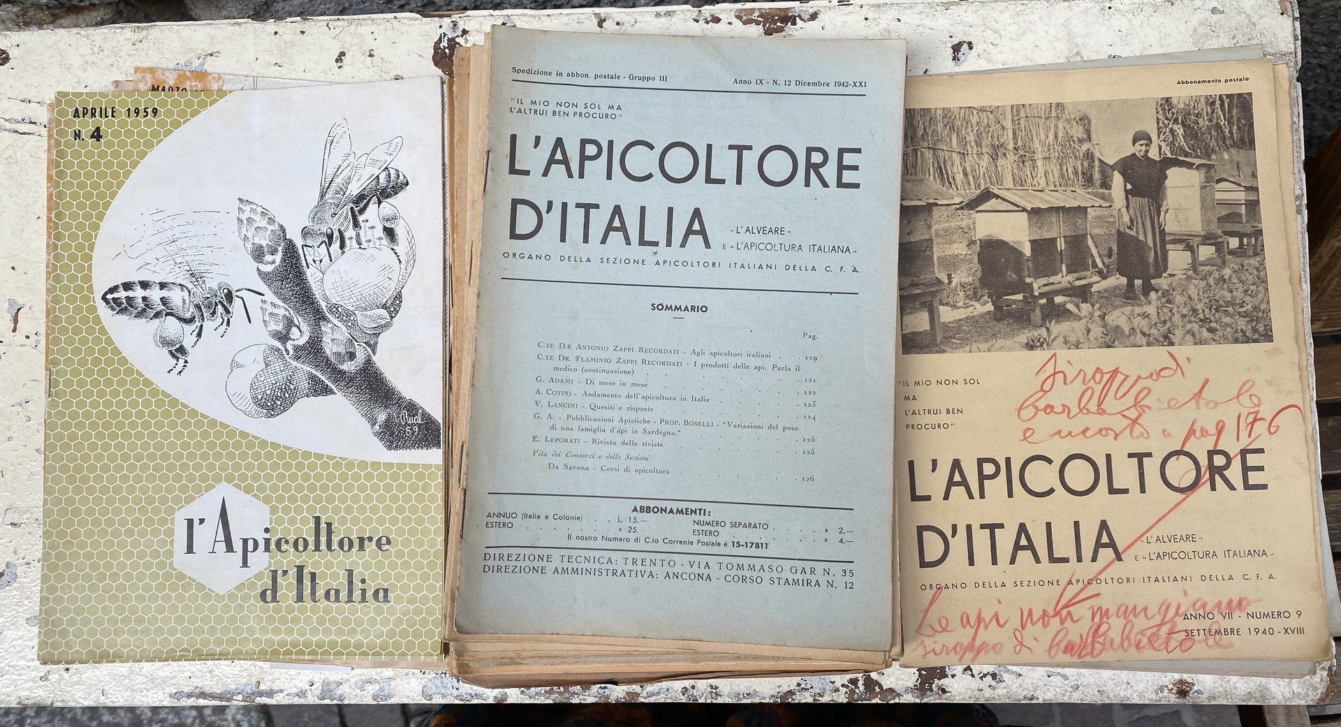 Numeri della rivista disponibili (anche da vendere singolarmente): 1940 anno VII n. 5, n. 8, n. 9, n. 10; 1942 anno IX n. 5, n. 7, n. 10, n. 11, n. 12; 1944 anno XI n. 6; 1946 anno XIII n. 5, n. 6, n. 7, n. 10, n. 11, n. 12, 1947 anno XIV n. 1-2; 1950 anno XVII n. 5, n. 6 (due copie), n. 7-8, n. 9, n. 10; 1951 anno XVIII n. 1, n. 7-8, n. 9, n. 10; 1959 anno XXVI n.1, n. 4, n. 6, n. 12; 1960 anno XXVII n. 2, n. 3. All'interno di ogni rivista si trovano diverse illustraz. b.n., pagine finali di pubblicità, consigli, lettere dei lettori e risposte della redazione, poesie, approfondimenti. Sulla copertina di ogni rivista si trova il motto dei cultori dell'apicoltura "il mio non sol ma l'altrui ben procuro". Le riviste sono in buono stato di cons. alcune presentano dei segni d'uso in matita e pastello, frasi e rimandi a penna.