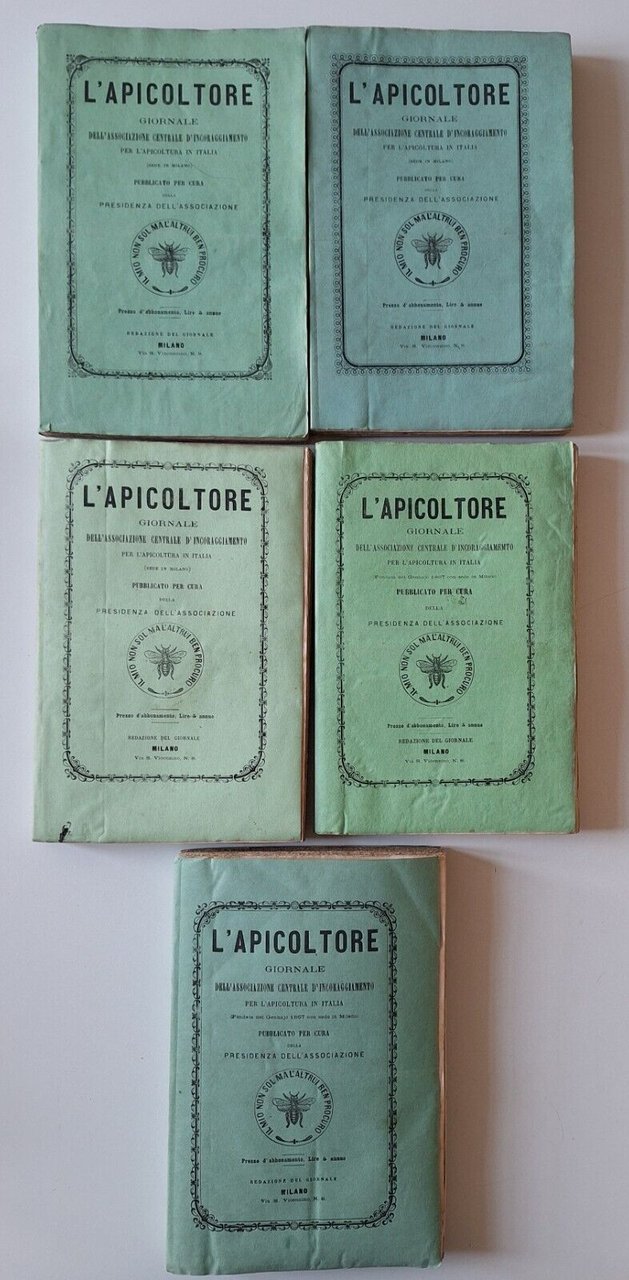 L'APICOLTORE GIORNALE DELL'ASSOCIAZIONE CENTRALE D'INCORAGGIAMENTO PER L'APICOLTURA IN ITALIAMILANO ANNATE 1868-69-70-71-72 In 8°, 5 volumi, legatura editoriale, copertina illustrata, vignette nel testo. 12 fascicoli mensiliLievissimi segni alle sovracopertine.