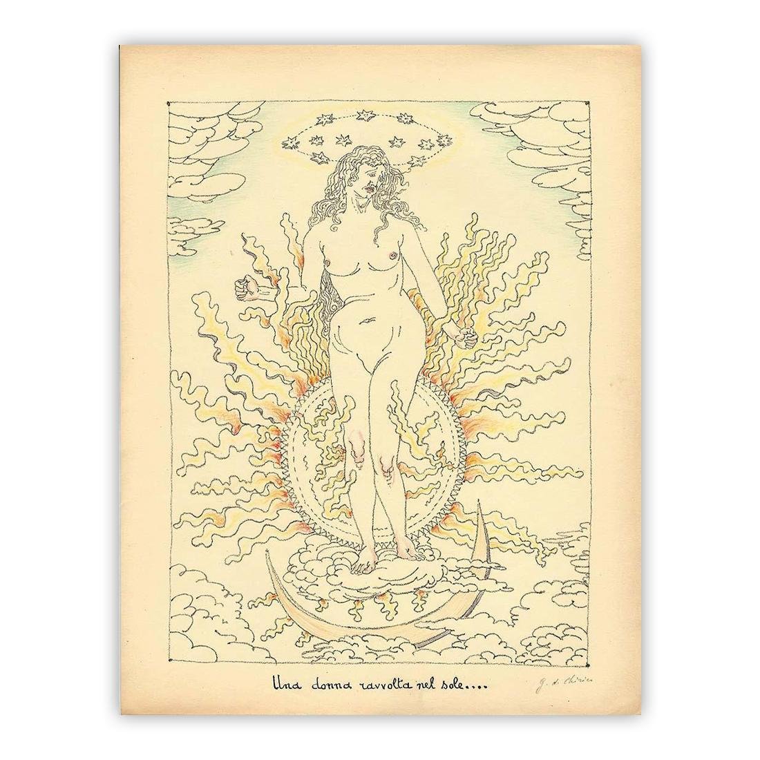 Giorgio De Chirico (1888-1978)" una donna ravvolta nel sole " 1941litografia originale firmata a matita in basso dall'artistaEsemplare colorato a pastello sotto la direzione dell'ArtistaDimensioni: mm 302 x 216 ( cm 34,5 x 27 )Numerazione edizione 86 /160Provenienza :Volume "L'APOCALISSE" Edizioni della Chimera Milano 1941Officina d'Arte grafica A.Lucini & C. In-folio cm 34,5 x 27 Pagine XXVI, 142, [4] e 20 Tavole litografiche originali di Giorgio de Chirico fuori testo stampato su carta Japon ( prima Edizione ) Volume numero 86 / 160 - (Tiratura complessiva 160 esemplari )Tutte le tavole sono firmate a matita in basso a destra da Giorgio De Chirico - Perfetto stato di conservazione generaleBibliografia / Pubblicazioni :Pubblicata nel catalogo ragionato dell' Opera grafica 1921 - 1969 Edizioni Bora Bologna 1996 Referenza Pagina 170 figura 114aC.O.A. Certificato di autenticità allegato