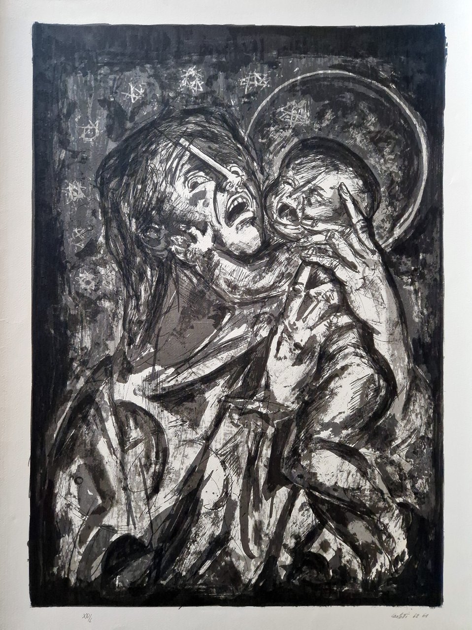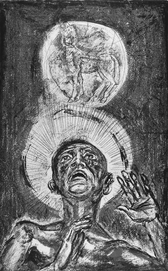 In folio massimo; pp. non num. 8 a quartini sciolti su carta a mano Miliani di Fabriano; segue la serie di 52 litografie originali in nero, ognuna con velina di protezione e passo dell'opera di riferimento; tutte firm. e numerate a matita. Cartella m.pelle edit. con angoli; titoli al dorso e al piatto. Superba edizione, tirata in Italia nel corso di due anni dal 1962 al 1964, e limitata a complessivi 150 esempl. numerati; questo nostro, perfetto, è il XXI/L; uno dei cinquanta esemplari contenente un disegno originale del Maestro a china e carboncino (studio per una tav. dell'Apocalisse), firma dell'Artista (1912-1977) al colophon. Opera rara e ricercata.<BR>(vedi riproduz.)
