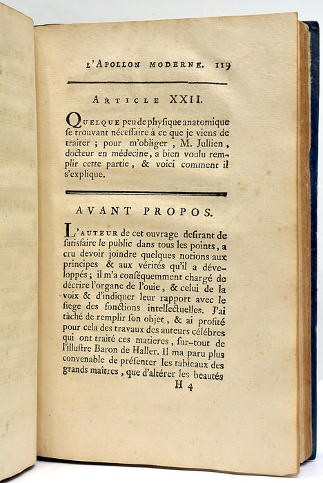 XXXII. 264 pages. 3 feuillets. (Les pages 116-117 sont gravées en taille-douce). (21,5x14 Cm). Demi-basane ancienne restaurée. Dos lisse. Titre doré. Coins et coiffes émoussés. Ouvrage très rare du musicographe lyonnais C. R. Brijon qui présente plusieurs aperçus intéressants et curieux. L'auteur y développe sa théorie pédagogique selon laquelle la musique participe au développement de l'intelligence, avec de nombreuses observations physiologiques sur le cerveau, la voix et l'oreille rédigées avec l'aide d'un médecin, le docteur Julien. Il avait notamment inventé un appareil appelé "Aurillette" servant à favoriser l'apprentissage des notes de musique, et qu'il vendait chez lui. Relié à l'époque sans mention de tomaison, notre exemplaire présente un collationnement identique à celui de la plupart des exemplaires que nous avons pu localiser dans les bibliothèques publiques. Exemplaire de seconde émission, avec le faux-titre et le titre réimprimés à la date de 1782. Quelques rousseurs et brunissures. Mention manuscrite d'appartenance à "Baussand professeur de musique à Lyon rue Lanterne (an 1868)". Rares taches et rousseurs.