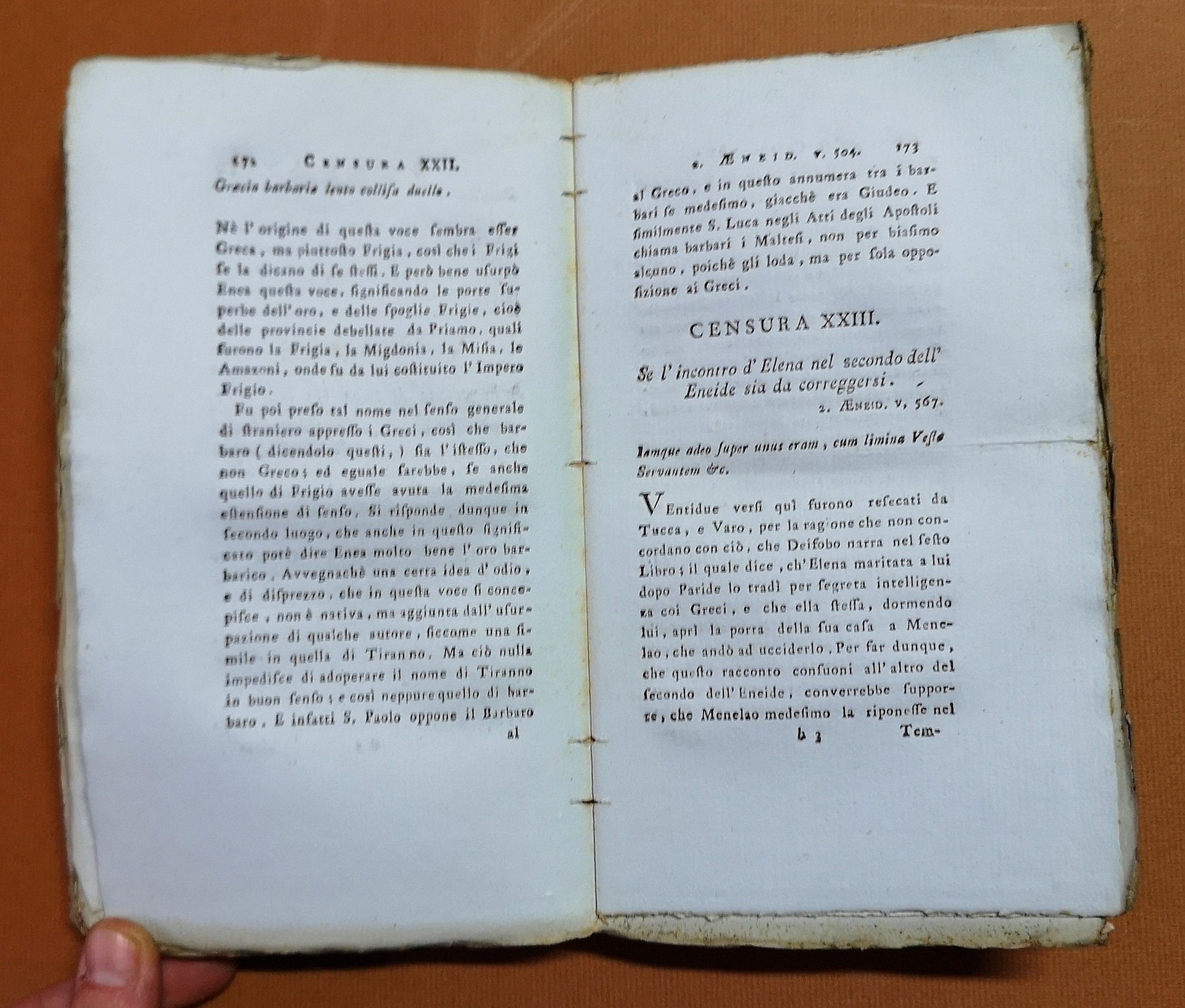 >1 vol. (di 2) in-8, pp. X, 294, vignetta in xilogr. al frontespizio e ritratto inciso del cardinale Angelo Maria Durini, a cui l'opera è dedicata. Legatura in carta muta coeva (dorso rinforzato). Edizione originale e unica, impressa su carta azzurra con caratteri belli e nitidi. Rara. L'opera consiste in una serie di risposte, ovvero "censure", a varie questioni di ordine filologico, critico, ma anche mitologico, storico, archeologico, scientifico. Il primo volume ripercorre i primi 6 libri dell'Eneide in 53 "censure". Ottimo esemplare, a pieni margini, con barbe, su carta azzurra (purtroppo mancante il secondo volume).