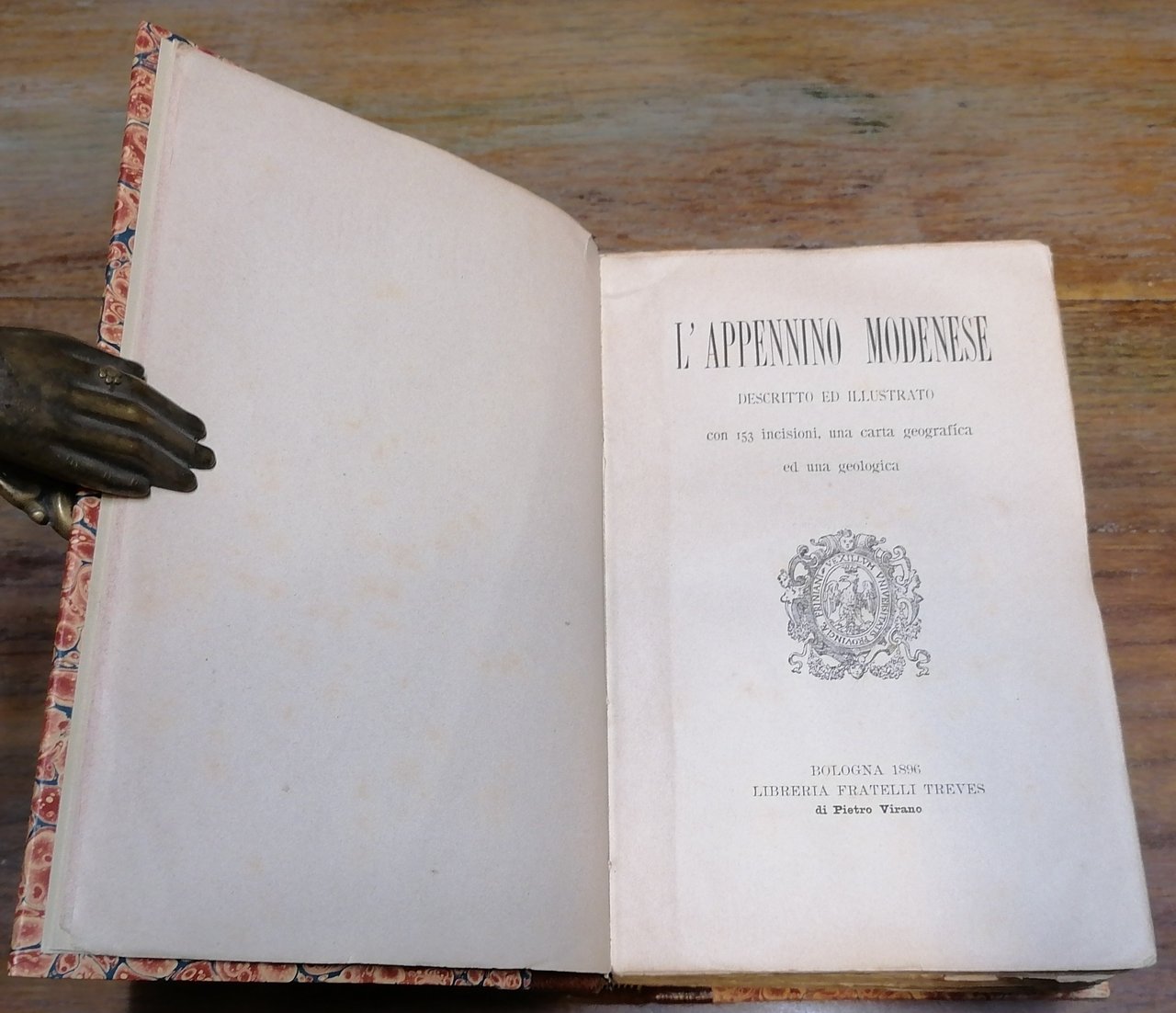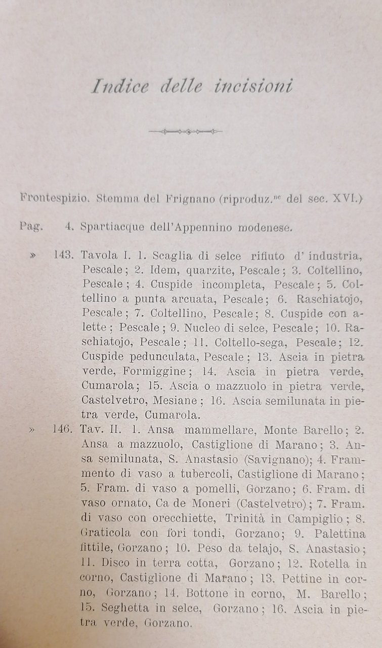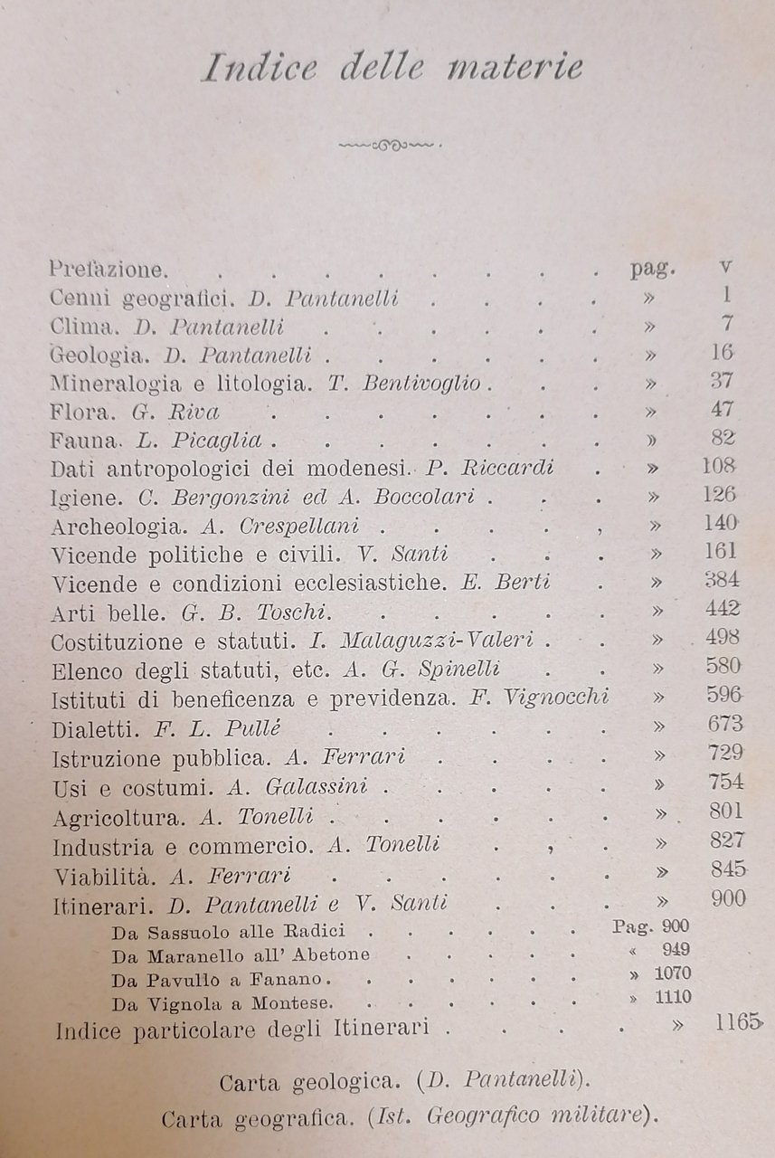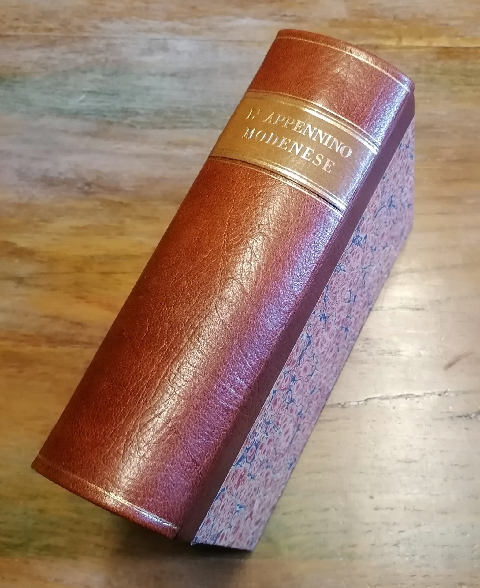 (Appennino modenese - Frignano - Montagna emiliana) In 8°, bella legatura in mezzo marocchino marrone a grana grossa, al dorso tassello in pelle ocra chiaro con titoli e filetti impressi in oro, carta marmorizzata policroma ai piatti, in barbe il taglio davanti e di piede, conservati i piatti della brossura originale con titoli e stemma : "Vexillum Universitatis Provinciae Friniani", stampati in nero in copertina, pp. XI,(1),1166,(2), con 153 figure nel testo (disegni, fotoincisioni), carta geologica del Pantanelli e carta dell'Istituto Geografico militare ripiegate alla fine del volume. Esemplare solido e ben conservato.