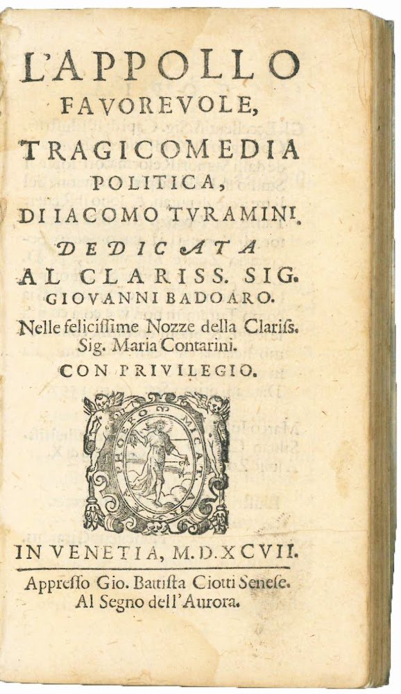 L'Appollo favorevole, tragicomedia politica, di Iacomo Turamini dedicata al Clariss. Sig. Giovanni Badoaro. Nelle felicissime Nozze della Clariss. Sig. Maria Contarini