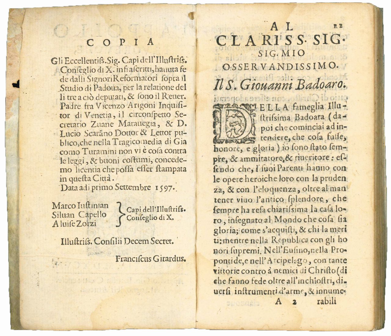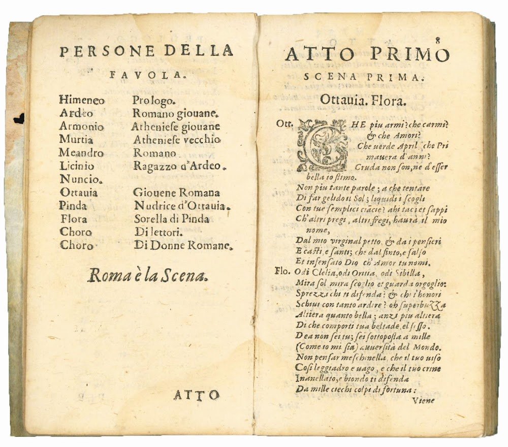 In the dedication, dated Venice, 20 September 1597, the author states that with this play he introduced something new into drama by bringing love stories far away from woods and rivers (i.e., pastoral and piscatorial dramas) and setting them for the first time in a urban landscape (Rome is the scene): “nel prendere argomento io della mia favola, Cittadino, & nell'introdurre Città, e Cittadini, forsi non ho fatto male” (l. A3v) (cf. L. Riccò, Minotauri, centauri, ermfroditi: misti e mostri teatrali italiani, in: “Norme per lo spettacolo, norme per lo spettatore: teoria e prassi del teatro intorno all' ‘Arte Nuevo' ”, G. Poggi & M.G. Profeti, Florence, 2011, p. 89).