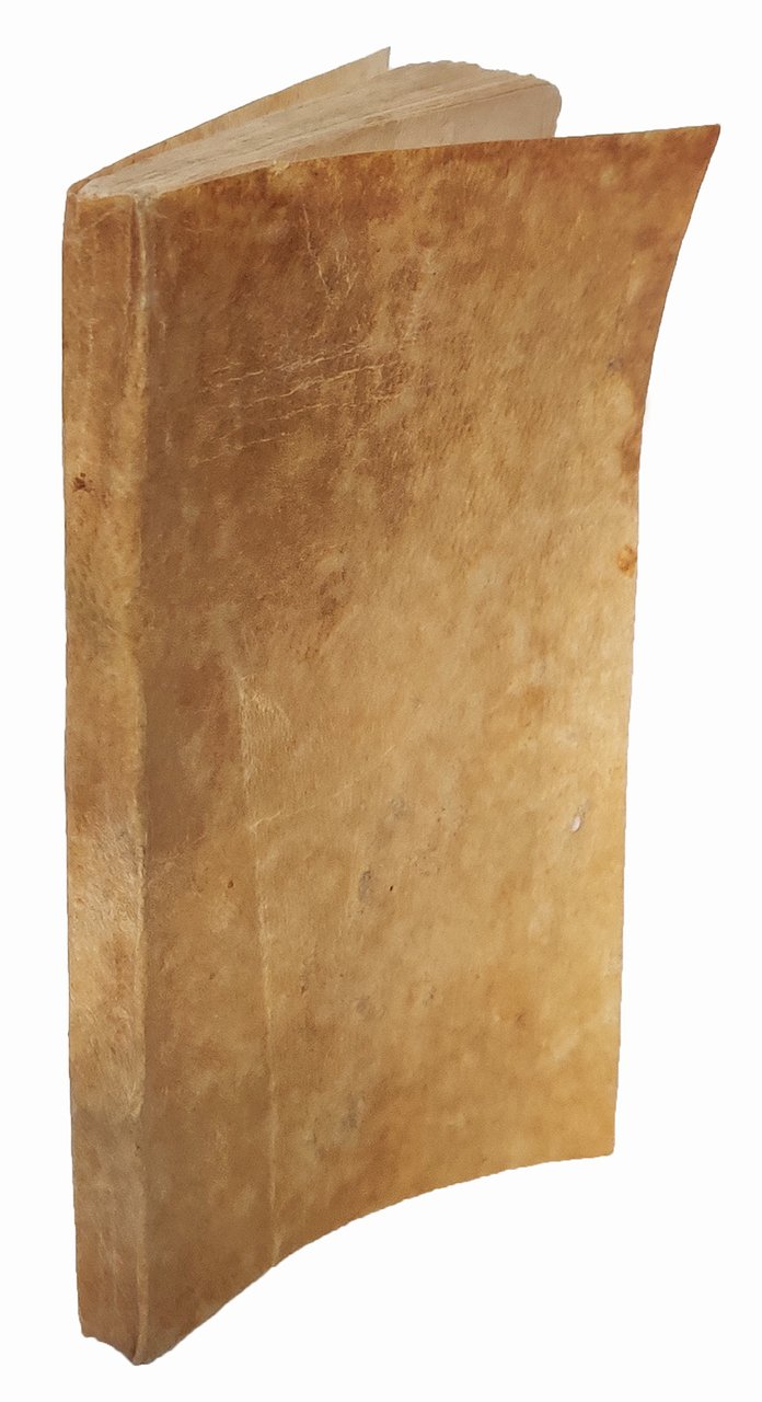 12mo (134x73 mm). 65, [1] leaves. Collation: A-E12 F6. The last leaf is a blank. Printer's device on title page. Roman and italic types. Woodcut decorative ornaments and initials. Later flexible vellum. On the last leaf verso manuscript dedication “Alla Serenis.ma Sig.ra Palazzina Anconitana” signed with the letter “G” and followed by the drawing of a heart within a square. Light marginal staining, more strongly in the second half of the volume.