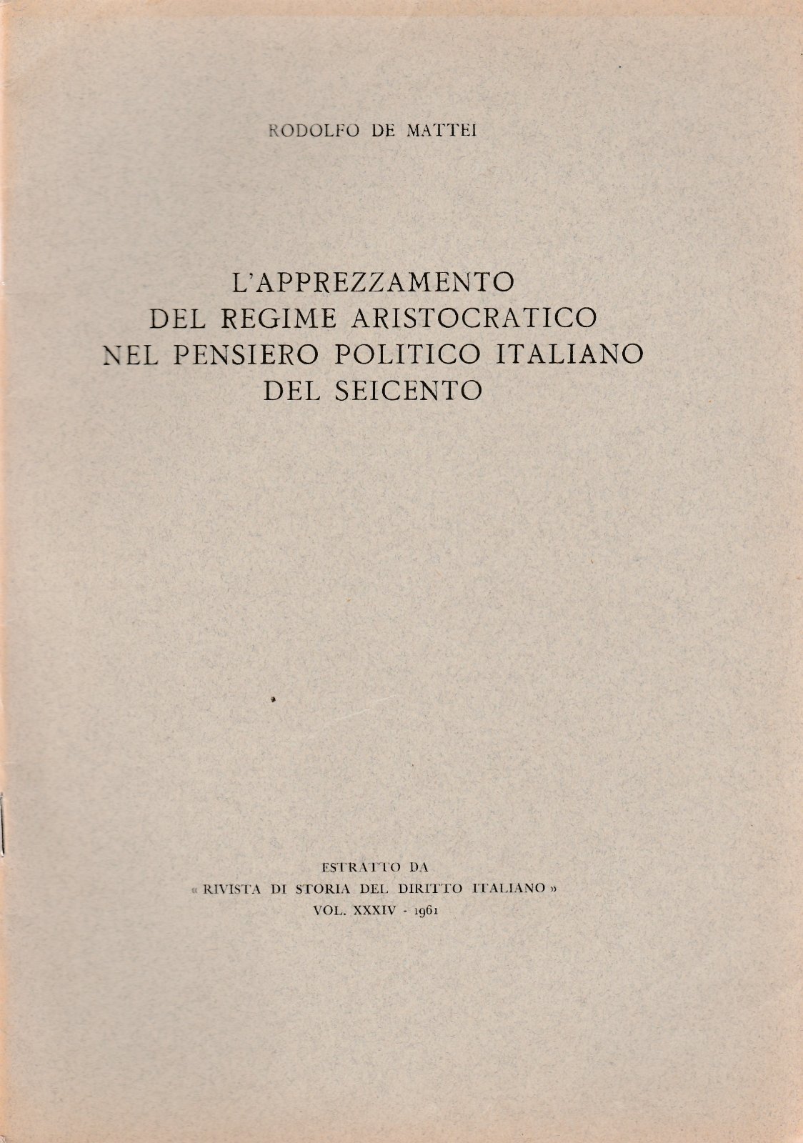 Rodolfo De Mattei L'apprezzamento del regime aristocratico nel pensiero politico italiano del seicento estratto da rivista di Storia Del Diritto Italiano vol. XXXIV 1961