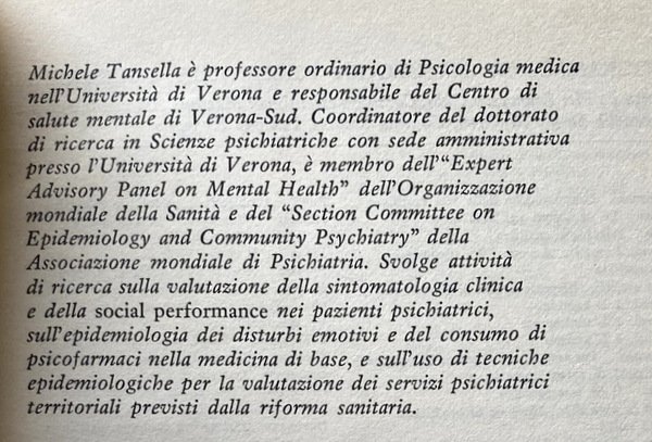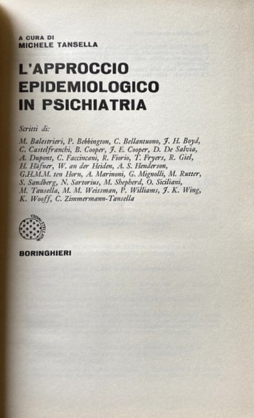 Scritti di: Matteo Balestrieri, Paul Bebbington, Cesario Bellantuono, Jeffrey H. Boyd, Cristiano Castelfranchi, John E. Cooper, Brian Cooper, Domenico De Salvia, Annalise Dupont, Michael Sheperd, Cristina Faccincani, Roberto Fiorio, Tom Fryers, Robert Giel, Heinz Hafner, Wolfram an der Heiden, A. Scott Henderson, G.H.M.M. ten Horn, Alessandra Marinoni, Giancarlo Mignolli, Michael Rutter, Seija Sandberg, Norman Sartorius, Micciolo, Orazio Siciliani, M. Tansella, Myrna M. Weismann, Paul Williams, John K. Wing, Kate Woof, Christa Zimmermann-Tansella.