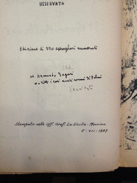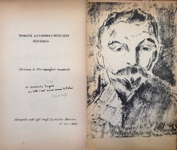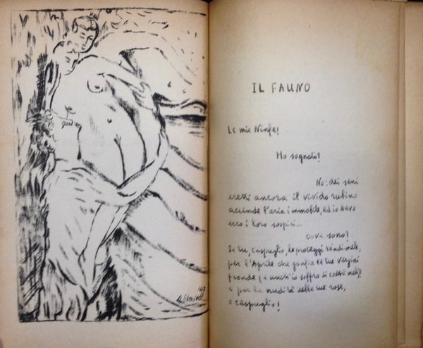 Edizione originale di 320 esemplari numerati e controfirmati a mano dall'Autore (esemplare 126). Brossura (cm 13,5 x 22), pp 62. Ritratto di Mallarm� disegnato da Giulio Schmiedt. Contiene una lettera prefazione a Luca Pignato; il saggio "I due fauni" (sulle due lezioni dell'Apr�s - midi); la traduzione di entrambe le versioni ("J'avais des Nymphes!" e "Ces nymphes je les veux perpŽtuerÈ). Chiude il volume il saggio di Pugliatti in veste di musicologo sul "Prelude" composto da Debussy per la poesia di Mallarm�. All'interno 2 disegni a piena pagina di Schmiedt. Copia lievemente brunita per il tipo di carta, restauro sull'angolo della copertina.