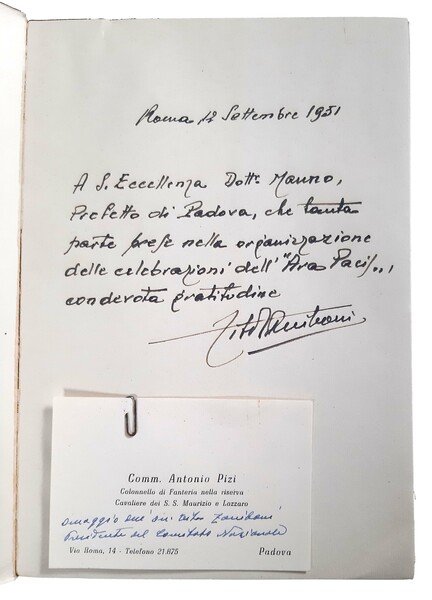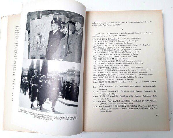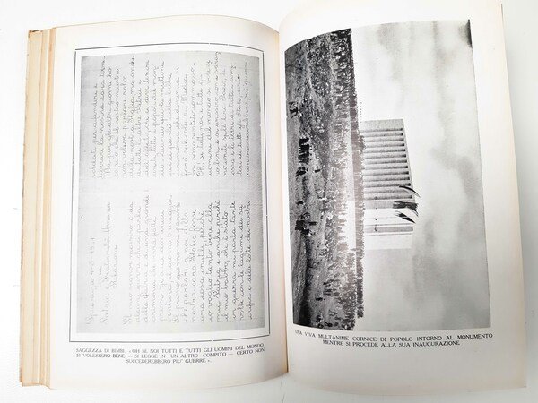 Un volume ( 24 x 17 cm); pp. 224, (7); num. ill. in b/n nel testo e f.t.; leg. in brossura editoriale con sovracoperta in carta con titolo e illustrazione al piatto anteriore; prima edizione, con dedica autografa del Presidente del Comitato e Presidente dell'U.N.U.C.I., On. Tito Zaniboni, fatta a Roma il 2 agosto 1951; trattasi di un documento storico di un evento di particolare interesse nazionale e locale, dall'alto valore morale ed umano, riferito alla grande cerimonia avvenuta nel 1951 della traslazione simbolica di tutte le salme dei Caduti sepolte in tutti i cimiteri di guerra d'ogni nazione, sparsi sul territorio italiano, prima da questi cimiteri all'Altare della Patria a Roma e poi da li a Medea (un colle ubicato vicino a Gorizia), nel monumento sepolcrale (Ara di Medea) appositamente costruito su progetto dell'architetto Mario Bacciocchi di Milano. Rif.: IT\ICCU\NAP\0242537. OCLC, 799264442. Cond.: Leggere tracce d'uso alla copertina; opera completa, autografata, in condizioni generali molto buone.