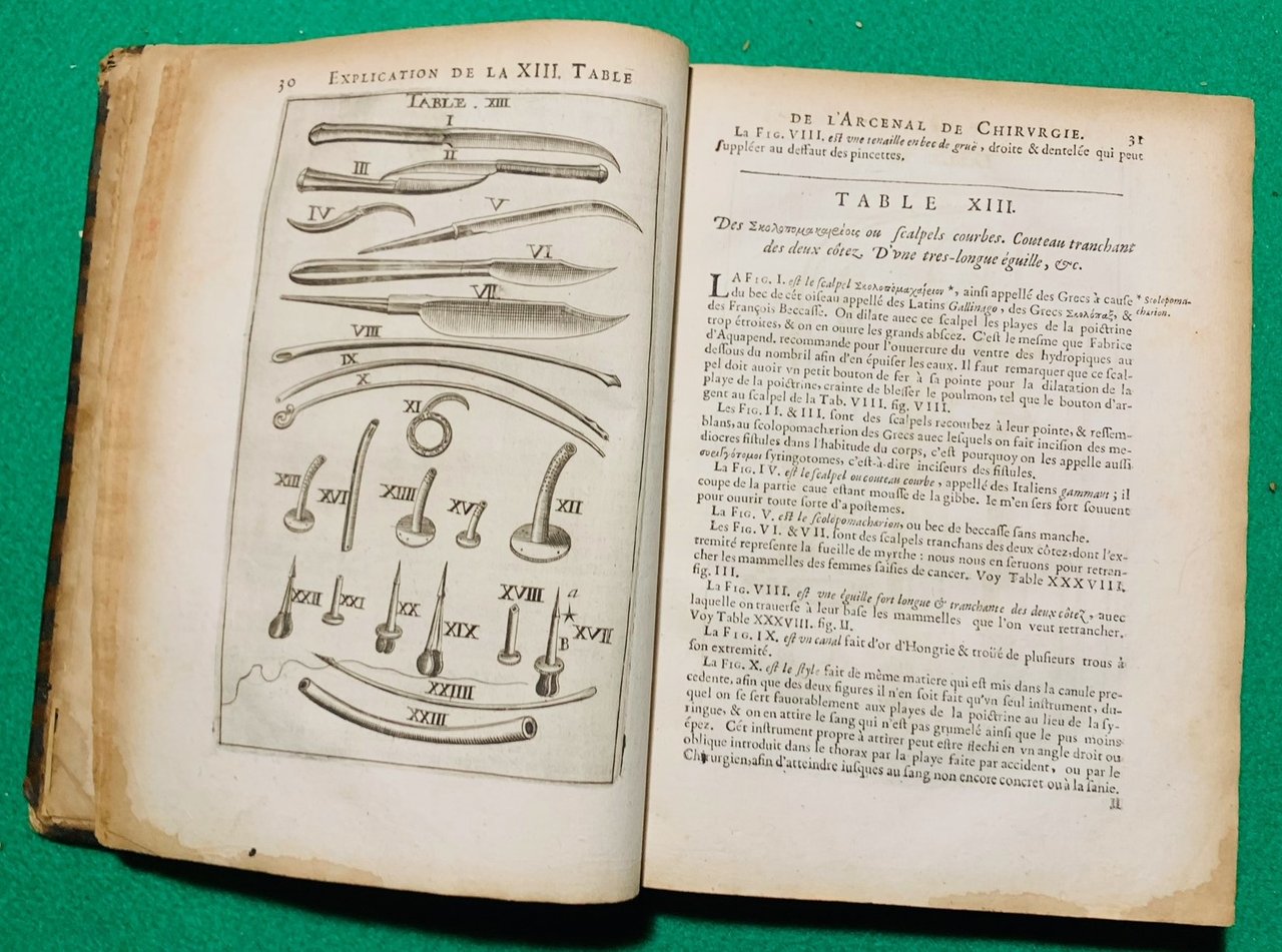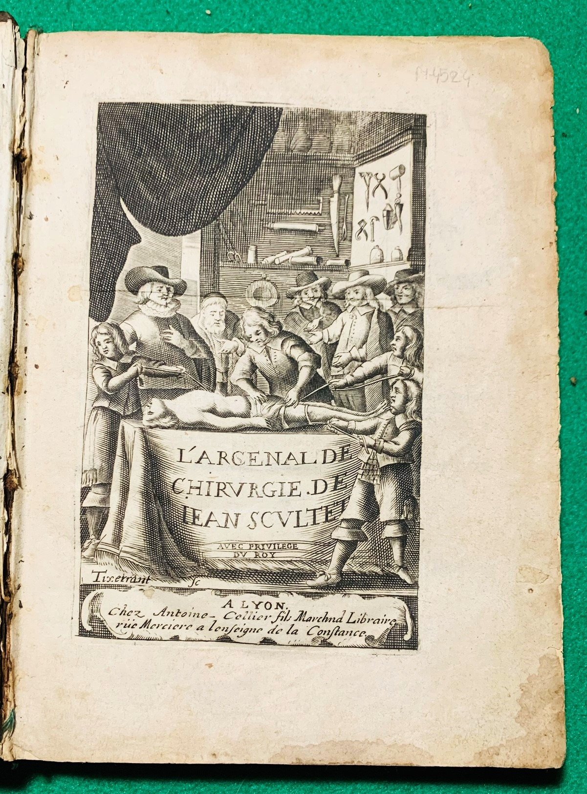 In 4°; (20), 385, (25) pp. compresa antip. calcogr. incisa da Tixerrand. Mancano la prima ed ultima carta bianca. Stemma calcogr. del dedicatario arcivescovo di Lione a c. ?3, inciso da P. Pinchard. Legatura coeva in piena pelle con dorso a 5 nervi. Titoli e fregi in oro al dorso. Difetto alla cerniera del piatto anteriore e qualche piccola mancanza al dorso. Antica firma di proprietà ed ex libris al piatto anteriore. Al frontespizio antico timbretto di proprietà privata ed al margine inferiore antica firma settecentesca di proprietà privata di chirurgo. 48 bellissime tavole a piena pagina con illustrazione di operazioni chirurgiche e strumenti medici. Pagine leggermente brunite, come in tutti gli esemplari, a causa della qualità della carta lionese utilizzata per stampare il volume. Qualche piccolo ed ininfluente alone all'angolo basso di alcune carte assolutamente non fastidioso o rilevante e nel complesso esemplare che all'interno del volume si presenta in buone condizioni di conservazione. Jean Scultet conosciuto anche come Johann Schultes o Scultetus Johannes (1595-1645) fu un celere chirurgo tedesco. Nato a Ulm , Jean Scultet era figlio di un barcaiolo e già questo lo distingueva dalla maggioranza dei suoi colleghi dell'epoca che provenivano da famiglie abbienti o di medici. Studiò medicina e chirurgia presso l'Università di Padova, dove fu allievo del grande Fabrizio Aquapendante e di Spigelius dal quale apprese l'arte della chirurgia. Nel 1621 ottenne la qualifica di Dottore in medicina, chirurgia e filosofia e dopo aver brevemente esercitato a Padova e Vienna ritornò alla sua città natale, aveva 30 anni. Scultet è considerato uno dei più importanti medici e chirurghi del suo tempo. Famoso per la sua abilità, la sua audacia e la grande inventiva, Scultet è celebre anche per aver creato numerosi strumenti chirurgici tra i quali alcuni particolarmente innovativi per la chirurgia, la flebectomia e vari apparecchi per la cura delle fratture. Ha sviluppato un tipo di benda che porta il suo nome. L'Armamentario Chirurgicum, la sua opera più importante, venne pubblicata a Ulm nel 1653 ed è considerata una delle opere più importanti della storia della chirurgia. L'opera, che uscì postuma dato che Scultet morì nel 1645 è illustrata da numerose incisioni che descrivono gli strumenti inventati dall'autore e fu pubblicato a cura di suo nipote. Il volume ebbe subito uno straordinario successo, fu subito tradotto in numerose lingue. Ad esempio la Compagnia delle Indie Orientale adottò la traduzione olandese dell'opera come testo ufficiale per la formazione dei sui medici. "One of the great illustrators of surgery and surgical instruments" (Garrison Morton). Questa edizione francese, la seconda, è fra le più rare mai stampate. Bibl.: Waller 8790.