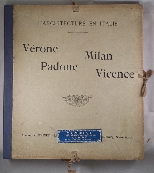 In-4 (30 cm) 1 cartella (2) 50 c. (di tav.) (invece di 51) Non rilegate, ma raccolte in una cartella editoriale in mezza tela chiusa da laccetti; sul piatto anteriore tassello "C. Crudo & C. Società Italiana di Edizioni Artistiche Torino 11, via S. Franc. Da Paola, 11". Manca tavola n. 51 (Palais Valmarana). 51 illustrazioni rappresentanti le opere più importanti di queste quattro città italiane. Ottime condizioni. Lingua francese