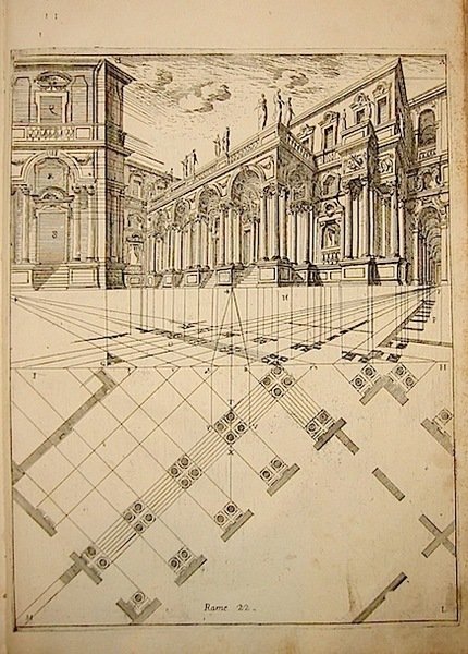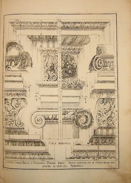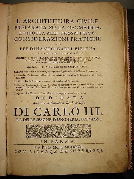 Folio (cm. 43), 10 cc.nn. (comprendenti il ritratto dell’A. a piena pagina), 156 pp., 1 c.nn. Con 72 tavv. incise su rame f.t. Grandi fregi e capilettera ornati n.t. Legatura coeva in mz. pergamena (restauri ben eseguiti alle cuffie). Piatti rinnovati in bella carta xilografata. Lievi tracce di polvere all’angolo inferiore di qualche carta. Alcune macchie perlopiù marginali tra le pp. 29-32, uno strappo, senza alcuna perdita, a p. 143 ed un secondo restaurato al margine bianco di p. 101. Nel complesso esemplare stampato su carta forte in ottimo stato di conservazione ed assai fresco. Rara edizione originale con le tavole avanti la numerazione. Il trattato del Bibiena (1657-1743) si occupa - nelle cinque parti in cui è diviso - di geometria, architettura civile, prospettiva, scenografia teatrale e meccanica. Anche le splendide incisioni di chiaro gusto barocco furono opera dell’A. medesimo. Fowler, n. 134; Riccardi (134): ‘bella e rara edizione’.