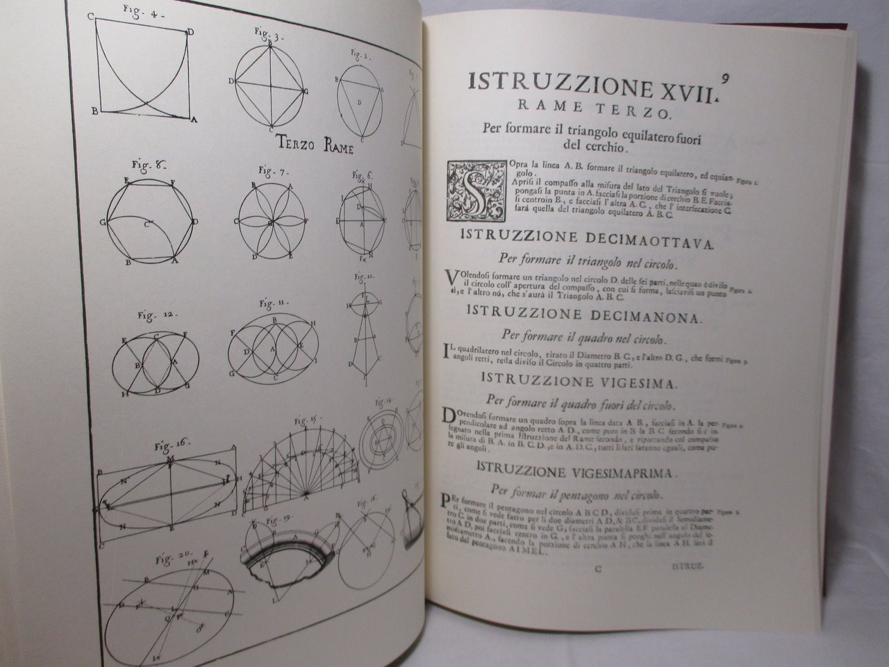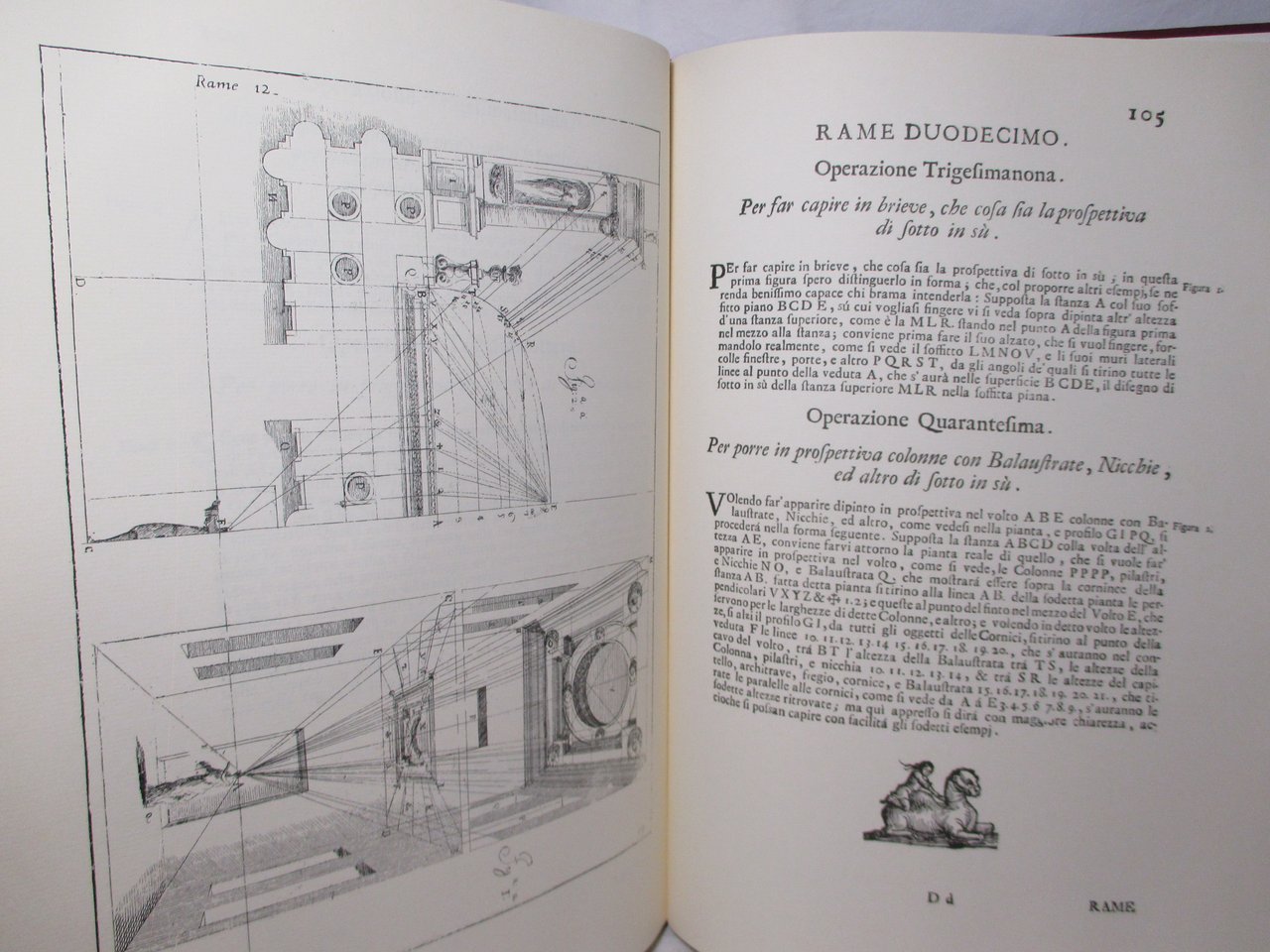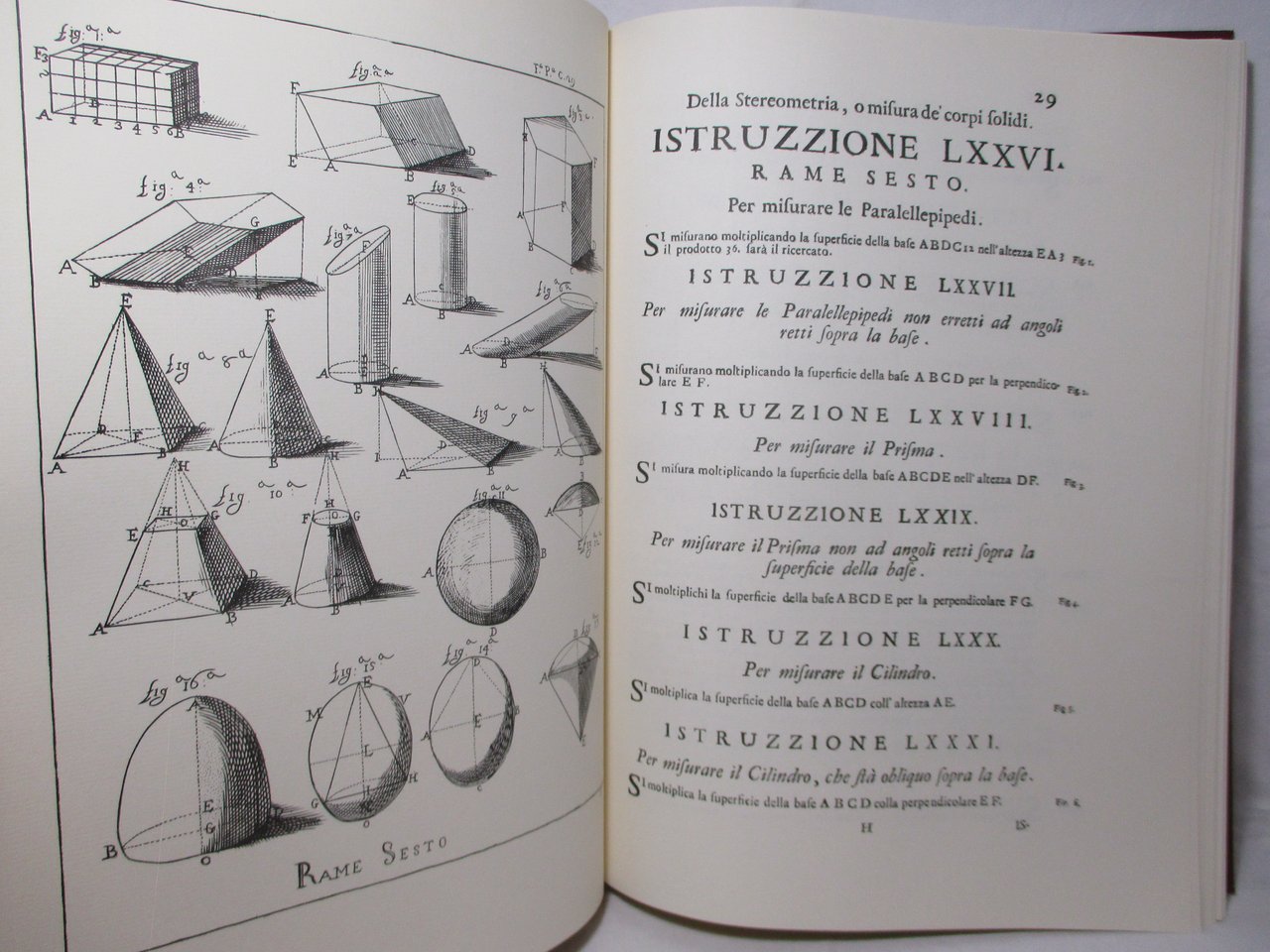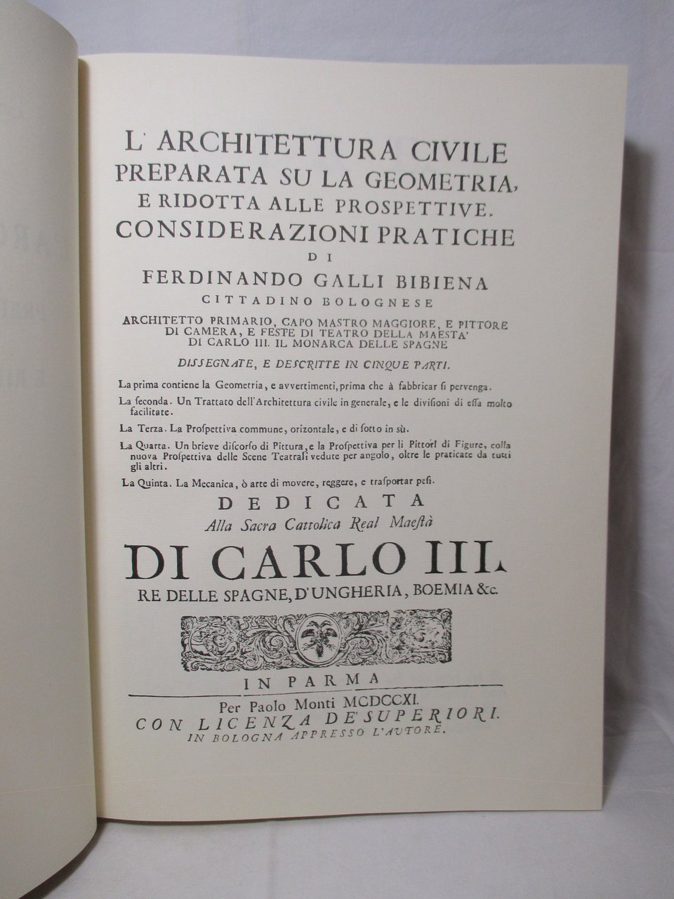 Grande volume in – folio ( misure 44x32 ), legatura editoriale rigida in tela con titoli in oro al piatto e al dorso, pp. 177. Con numerose tavole fuori testo. Ristampa anastatica dell'edizione pubblicata a Bologna nel 1711.