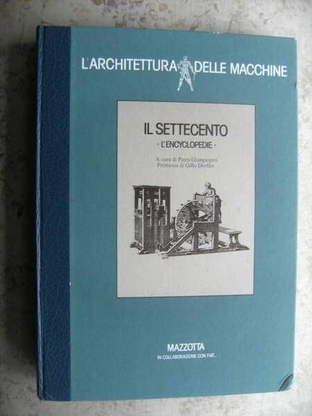 In 4°, pp 157 con molte tavole in nero. Tela editoriale rigida con copertina figurata e custodia. Le macchine del XVIII secolo, "dove il binomio utile-bello ha avuto ancora diritto di cittadinanza". Il libro ne presenta una selezione, tratta dall'Encyclopédie di Diderot e D'Alembert. Ottimo esemplare.