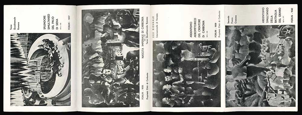 EPHEMERAEdizione originale.Ottimo esemplare.In copertina il classico “duce” di Forlin (Il condottiero, 1936), nel soffietto interno le riproduzioni del «Palio di Siena» 1937, «Nascita di Carbonia» 1938, «Ardentismo aeropittorico del creatore di Carbonia» 1939, «Ardentismo simultaneo della battaglia del grano» 1940. Nel soffietto esterno, il manifesto, su due facciate, con indicazione al piede «Resto del Carlino - 3 giugno 1940»; quindi una facciata di giudizi che comincia con il «Collaudo di S.E. Marinetti». Molto raro.Cammarota, Futurismo, n. 212.1