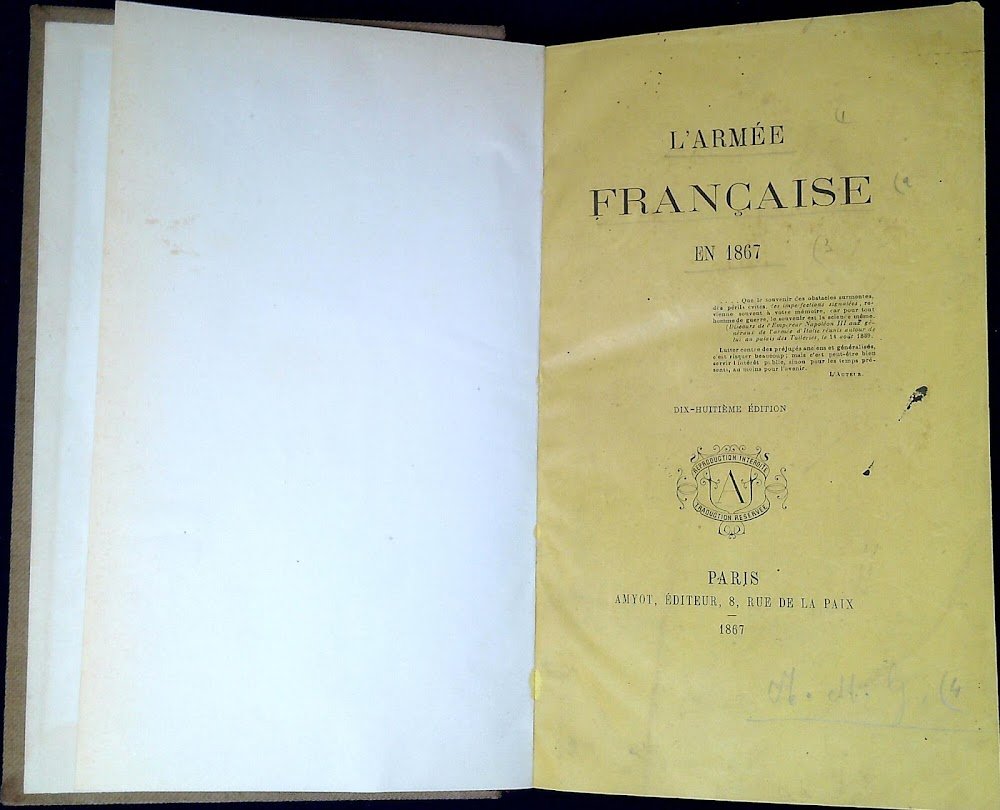Trochu, Louis Jules L'armée française en 1867. Paris, Amyot 1867, X, 287 p. ; 21 cm (64339)