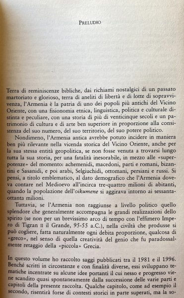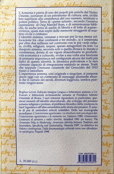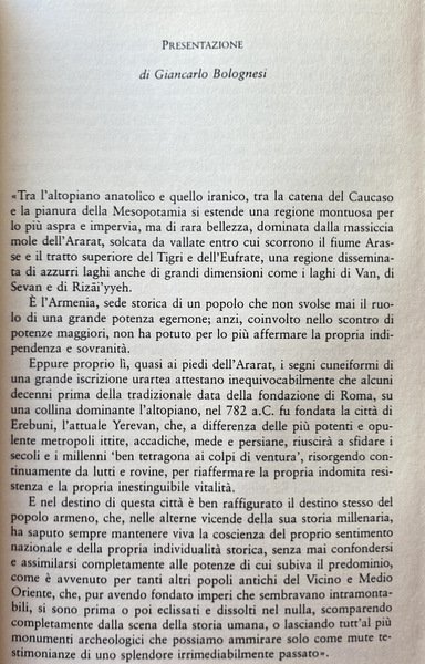 L'Armenia è patria di uno dei popoli più antichi del Vicino Oriente, portatore di un patrimonio di cultura, arte, civiltà ben superiore alla consistenza del suo numero, territorio e potere politico. Terra di "pietre urlanti", secondo l'incisiva espressione di Osip Mandel'stam, e di reminiscenze bibliche, fu anche terra di aneliti di libertà e di lotte di sopravvivenza, quasi mai sopiti dalle memorie struggenti di martirio civile e cristiano. L'identità armena, venutasi a trovare per la sua stessa collocazione tra "due continenti e tre mondi", si è cementata per oltre due millenni nel confronto con le più varie culture, civiltà, religioni, imperi, spesso antagonisti tra loro. La diaspora armena, seconda solo a quella ebraica in durata e consistenza, dotata di un vigore straordinario in produttività economica e culturale, svolse a sua volta una funzione di primaria importanza nel configurare alcuni dei tratti più tipici di questa identità: la dinamica polivalente e la non comune capacità di integrazione restando se stessa. Tratti che neppure l'immane catastrofe del Genocidio del 1915 riuscì a cancellare. L'esperienza armena, così originale e singolare, si propone ancor oggi con un contenuto di messaggi altamente attuali che il cumulo dei secoli, divenuti leggenda, sembra piuttosto ringiovanire.