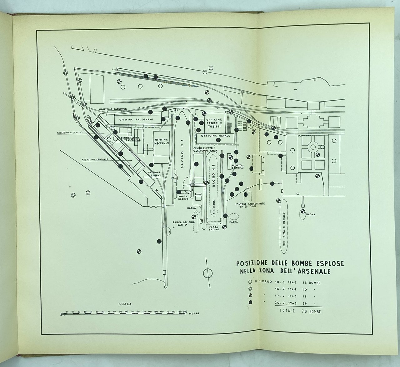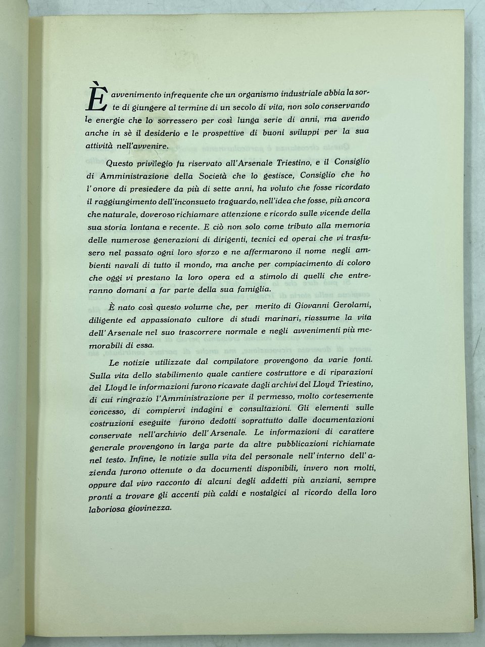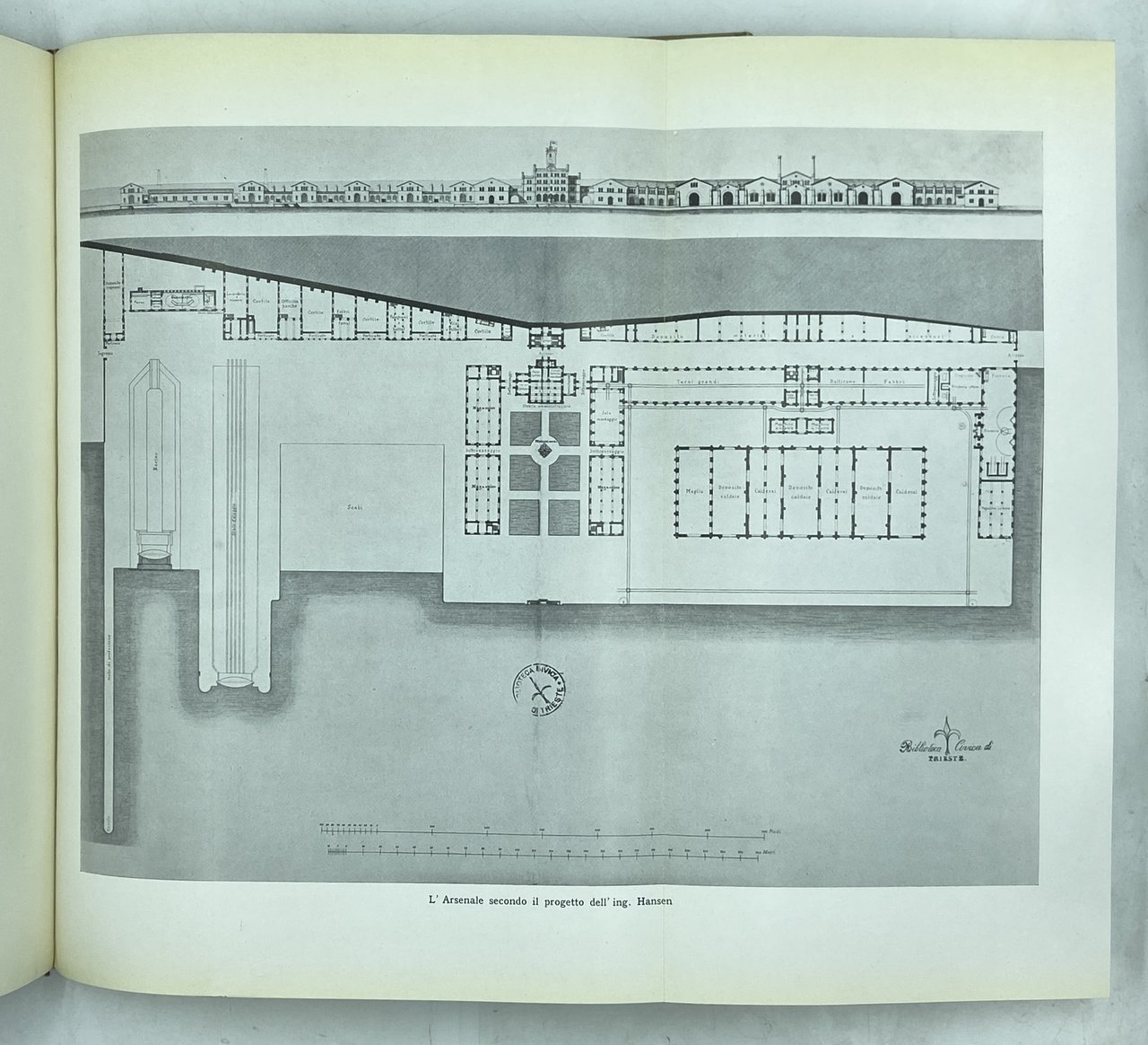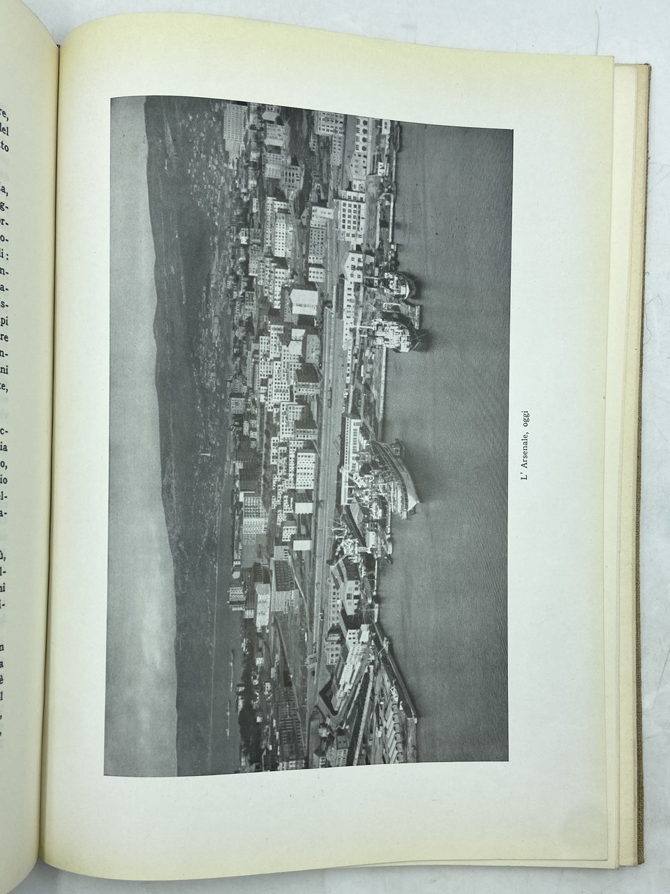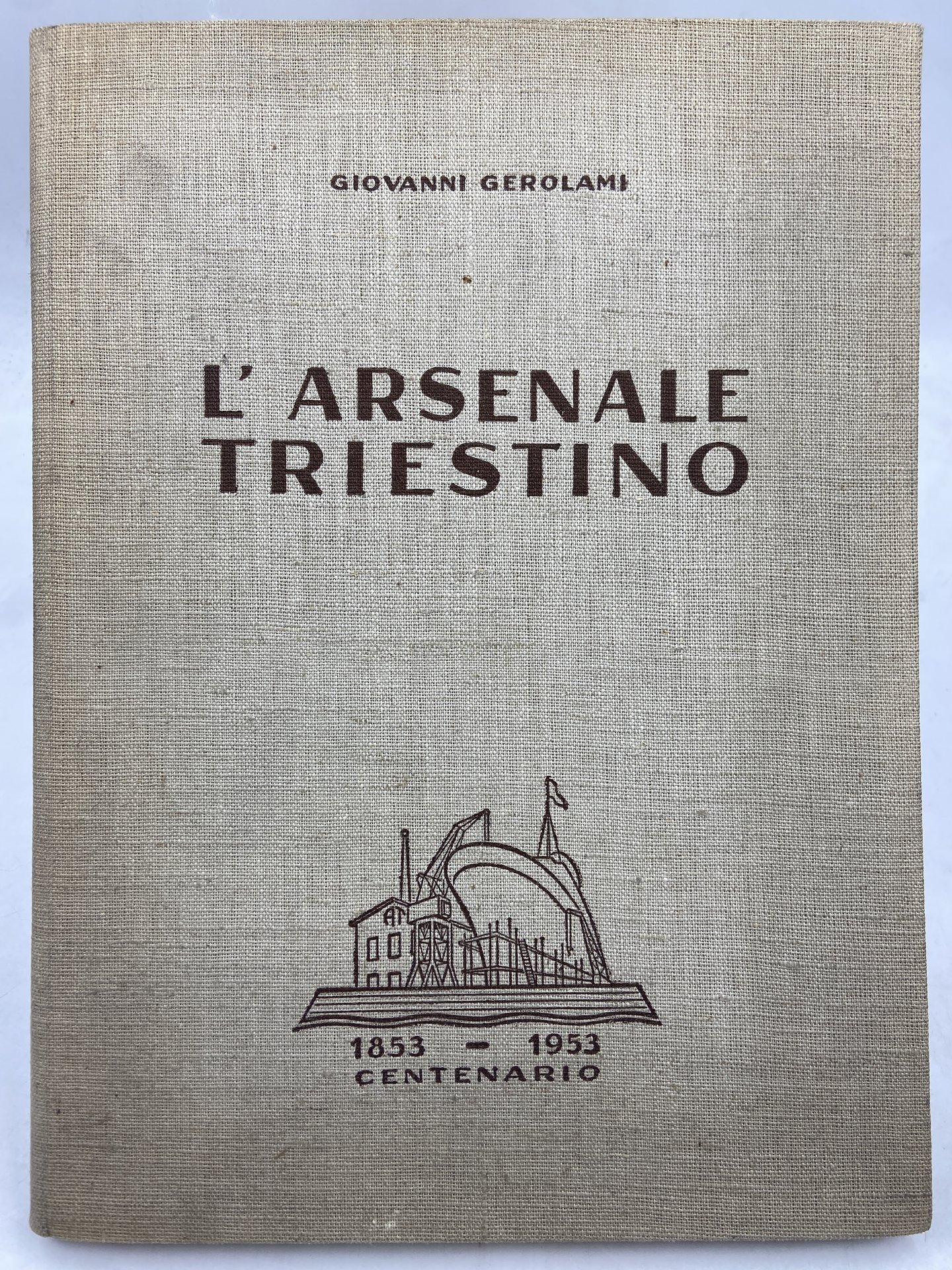 Tela editoriale illustrata, cm 29.5 x 22.5, pp (8) 76 (6), illustrazioni in nero intercalate al testo su 16 tavole patinate, una tavola ripiegata con pianta di Trieste e in calce al volume VII tavole ripiegate con piante e grafici e 8 tavole con sagome delle navi costruite dall'Arsenale. Buono stato. Monografia aziendale dedicata alla storia dell'Arsenale del Lloyd Triestino, inaugurato nel 1853 nel vallone di Muggia; l'arsenale fu a lungo sede di costruzione navale e nel 1912 venne convertito in cantiere di riparazione. Il volume è illustrato con diverse piante che mostrano l'estensione dell'Arsenale nel corso degli anni, fotografie degli edifici e del personale, e progetti e profili di navi costruite dagli stabilimenti, dalla nave a pale Egitto (1862) al piroscafo Helouan (1912). Prefazione del presidente dell'Arsenale Ferruccio Smeraldi.