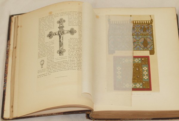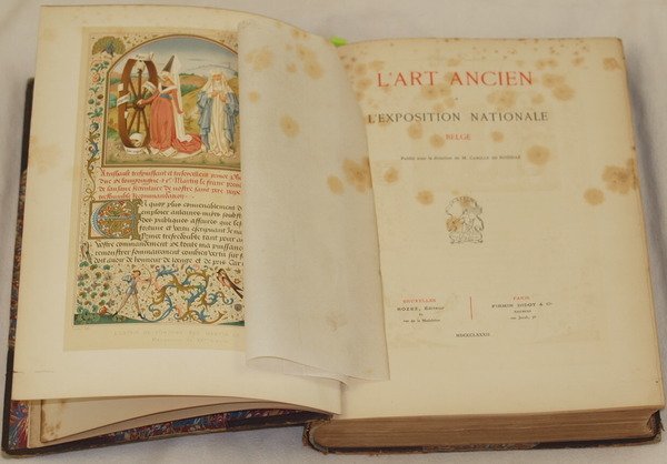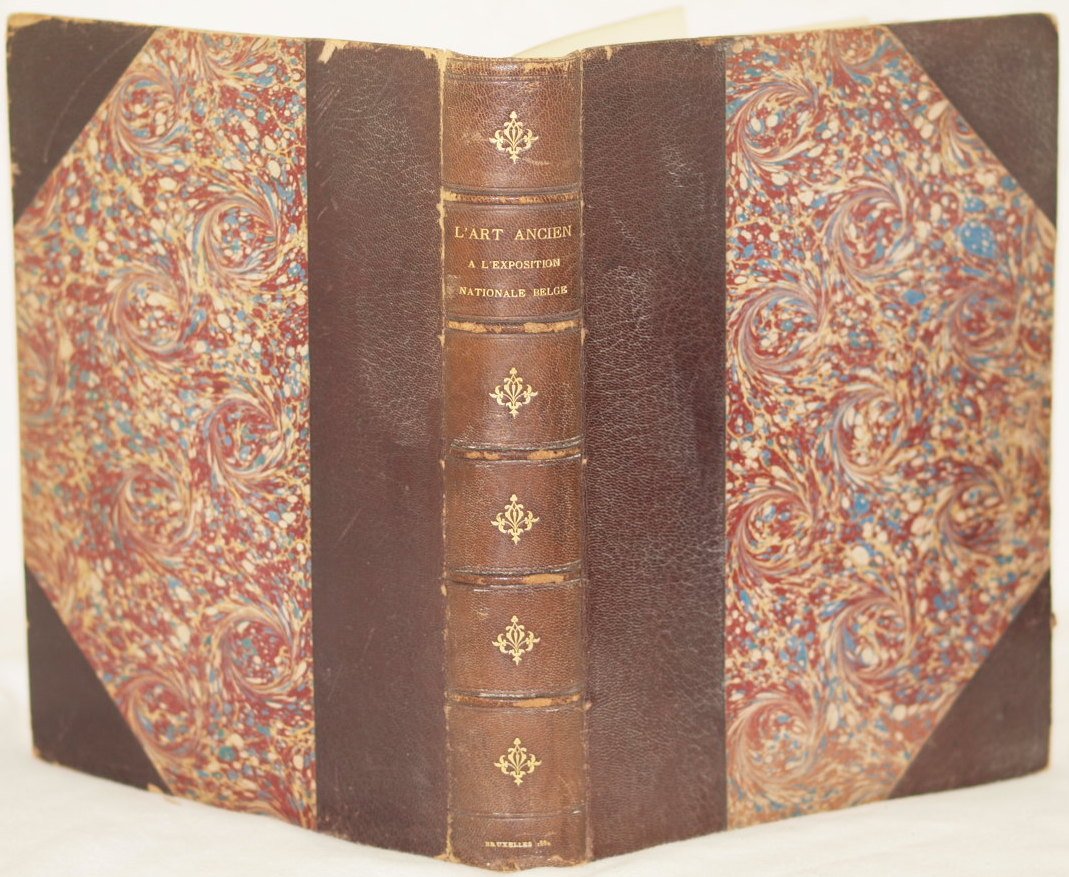 In folio. Dim. 33x24,5 cm. Pp. (6)+396. Peso Kg. 3,300. Bellissimo volume del 1882 sull'arte antica belga all'esposizione nazionale.<BR>Il volume è un vero e proprio catalogo degli oggetti d'arte industriale belga dal medioevo all'oittocenti presenti all'esposizione del 1881. Numerose xilografie raffigurano oggetti d'arte e gioielli con relativa didascalia. Numerose planches fuori testo: cromolitografie, acqueforti, planches. Le antichità e gli oggetti d'arte descritti: Gioielleria, Gioielleria civile, ottone, medaglioni e medaglie delle antiche provincie belghe, armature, ferro, cofanetti, tapezzerie storiche, mobili, manoscritti, strumenti musicali, stoffe e pizzi, ventagli, vetrate dipinti e vetri, gres, ceramiche di elfi e Tournai, Faiences di Bruxelles e altre città, Arte italiana ecc.<BR>Bella copertina in mezza pelle a cinque con titolo in oro.<BR>Brossura editoriale conservata.<BR>In buone condizioni Copertina in mezza pelle con titolo in oro al dorso in buone condizioni generali con lievi usure ai margini e dorso (vedere foto). Legatura in buone condizioni. All'interno le pagine si presentano in ottime condizioni con rare fioriture. Very beautiful volume of 1882 about belgian antique art in national exposition.<BR>The volume is a real catalogue of items of belgian industrial art from middleage until X§IX century in the exposition of 1881. ifferent woodcut represent art items. different out of text planches: chromolytographies, etchings, planches. Antiquites and items of art described: Jewellery, civil jewellery, bras, medals, iron, cases, historycal fabrics, furniture, manuscripts, msuical instruments, fabrics and embroidery, glasses, gres, ceramics of Tournai, Faiences of Bruxelles and other cities, Italian art ecc.<BR>Beautiful half leather cover with golden title.<BR>Editorial cover preserved. In good conditions Half leather cover with golden title in the spine in good general conditions slightly worn in the edges and spine (see the photo). Binding in good conditions. Inside pages are in very good conditions with occasional foxings.
