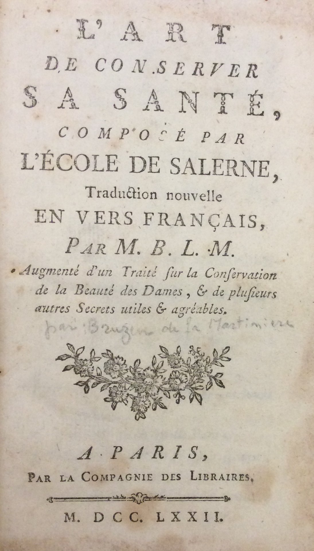 L'ART DE CONSERVER SA SANTE, COMPOSE PAR L'ECOLE DE SALERNE. - Traduction nouvelle en vers français, par M. B. L. M. Augmenté d'un Traité sur la conservation de la Beauté des Dames, & de plusieurs autres Secrets utiles et agréables.