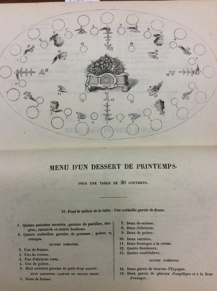 In-16 (mm. 173x105), mz, pelle coeva, fregi e titolo oro al dorso, pp. VIII,285, con 5 (e non 6 come indicato sul frontesp.) tavole xilografate di cui 1 dedicata agli utensili necessari per la preparazione di gelati e sciroppi e 4 ai menus d'un dessert d'hiver, de printemps, d'été et d'automne, pour une table respectivement de 16, 20, 32 et 40 couverts.Questo prezioso volume contiene les meilleures recettes pour faire les "glaces, sorbets, café, punch, chocolats, thés, marmelades, confitures, pates, fruits à l'eau-de-vie, sirops," etc.; suivi de la construction d'une glacière, d'une distribution indiquant la quantité et l'ordre du service à faire pour recevoir depuis 25 jusqu'à 200 personnes; de menus de desserts de Déjeuners, Diners et Soupers pour les 4 saisons; orné de 6 planches gravées pour le service des desserts, et indiquant les ustensiles nécessaires à la confection des glaces. Ouvrage entièrement neuf, utile aux gens du monde, et indispensable aux limonadiers, restaurateurs, confiseurs, maitre d'hotell, épiciers, etc..La ns. è una contrefaçon belge, parue à Bruxelles la meme année que l'originale de Paris, publié par Barba, avec le titre legèrement modifié (inizia con l'Art de donner.. invece che Le glacier royal ou l'Art..). Così Vicaire, pp. 86/87. Cfr. anche Bitting, p. 38.Aloni e fiorit. interc. nel testo, ma complessivam. buon esemplare.
