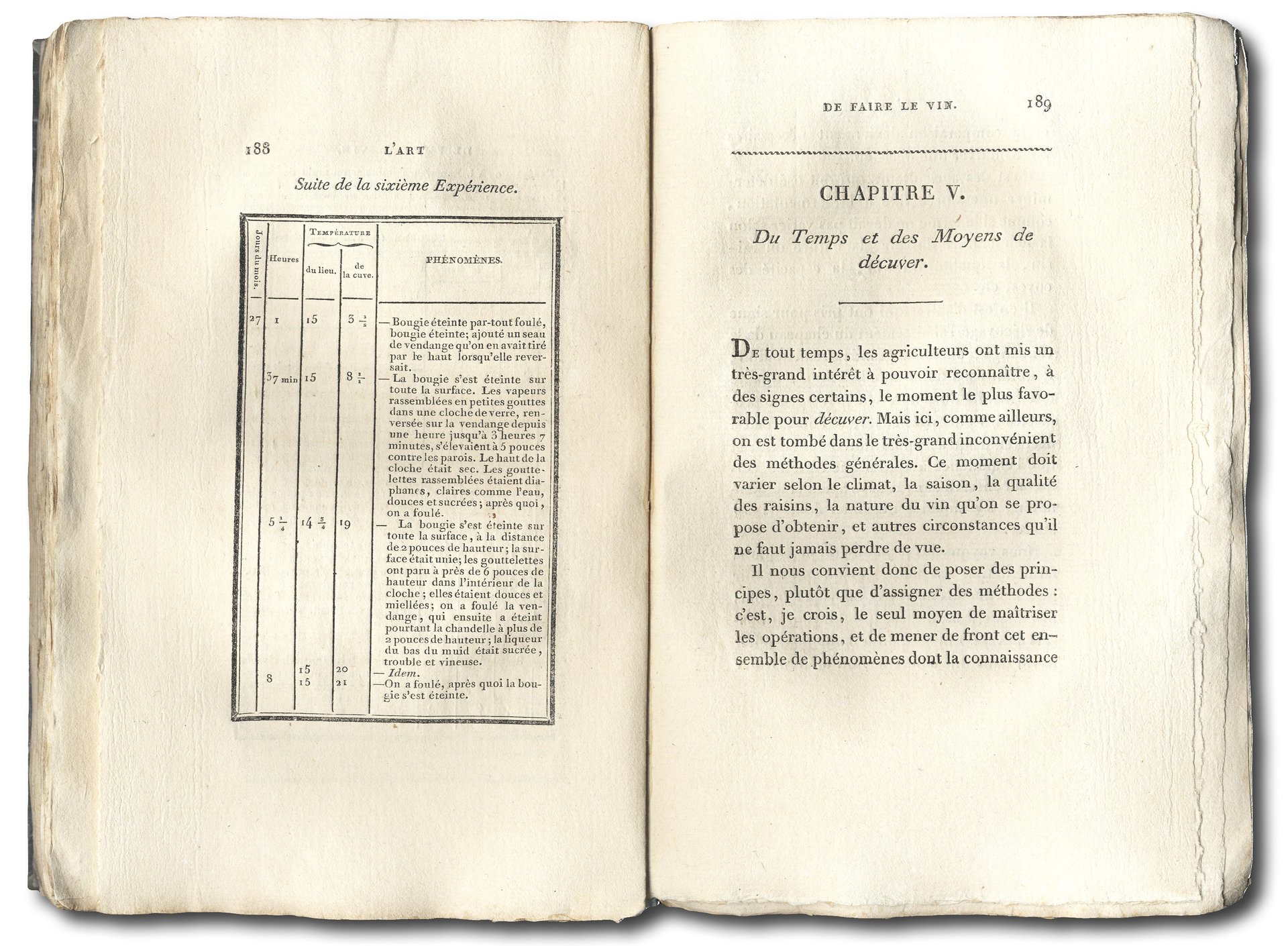 >in-8, pp. XVI, 381, legatura in carta muta coeva, titolo manoscritto su tassello in carta al dorso. Con una tavola ripiegata f. testo inc. in rame. Due dettagliati indici, dei capitoli e delle materie. Vasto e importante trattato enologico su ogni particolare aspetto della vinificazione, fermentazione e conservazione dei vini. Esemplare a pieni margini, assai bello. Simon, Biblioteca Vinaria, p.19. Oberlé, Les fastes de Bacchus, pp.948-951.
