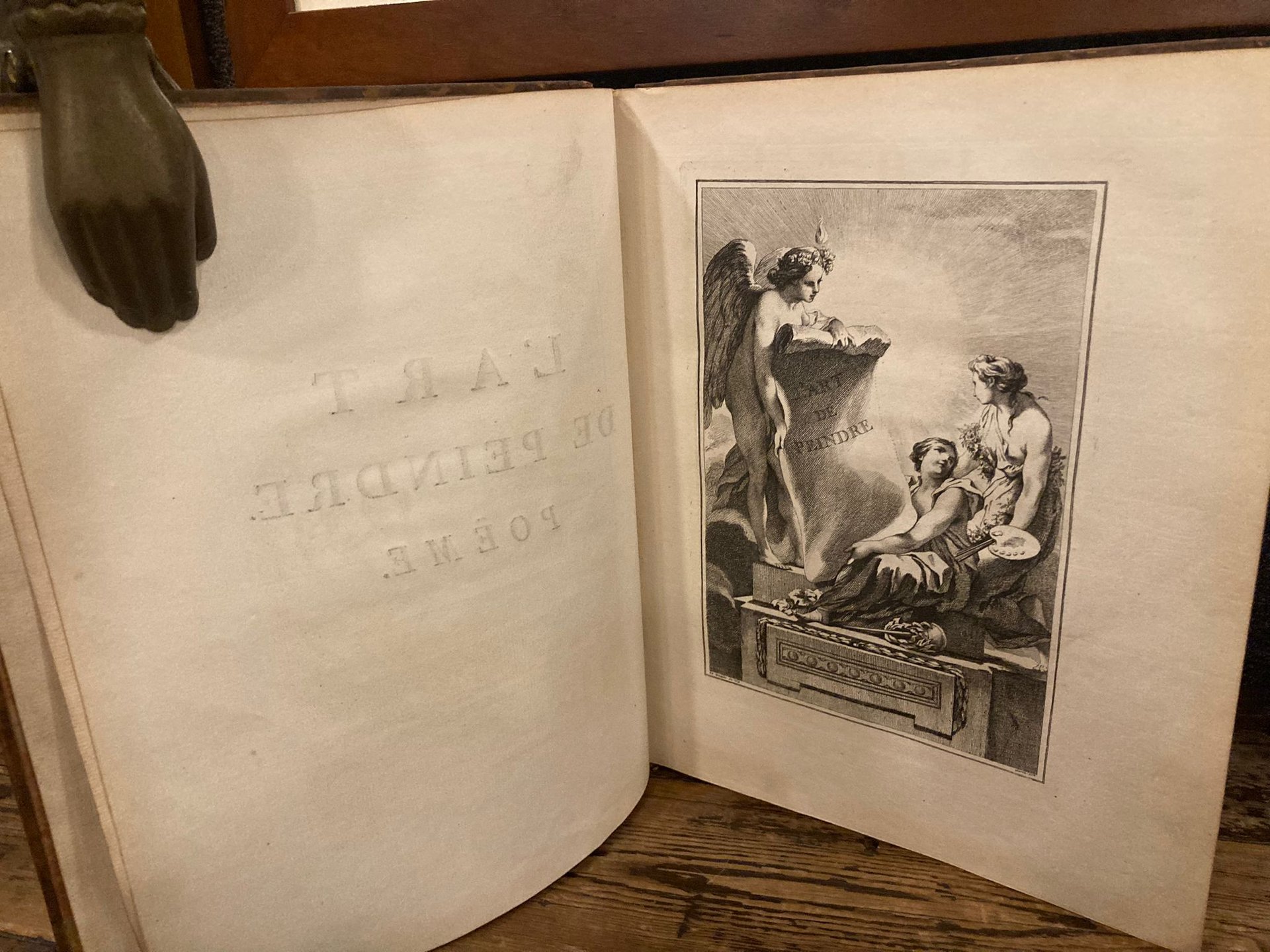 In-4° (295x230mm), pp. (4), XIX, 144, (2), legatura coeva in pieno vitello marmorizzato con dorso a 5 nervi adorno di titolo oro su tassello rosso e di fregi in oro negli scomparti. Triplice bordura di filetti dorati lungo il perimetro dei piatti. Tagli dorati. Fogli di guardia in carta in decoro policromo a piuma di pavone. Antiporta allegorica incisa su rame, 20 tra testatine, culs-de-lampes e vignette n.t. incise su rame all'acquaforte e 2 tavv. n.t. incise al tratto raffiguranti le statue di Antinoo e della Venere di Milo, il tutto disegnato e inciso dallo stesso Watelet. Precede il testo una spiegazione delle figure in rame. Dedica a stampa ai membri dell'Académie Royale de Peinture et de Sculpture'. Fresco e marginoso esemplare impresso su carta greve. Prima edizione di questo poema didascalico sulla pittura in quattro canti, seguito (pp. 63 e sgg.) da delle 'Réflexions sur différentes parties de la Peinture'. I canti proemiali hanno rispettivamente per oggetto il disegno, il colore, l'invenzione pittorica e l'invenzione poetica. Le 'Réflexions' discorrono delle proporzioni, dell'insieme, dell'equilibrio della composizione, della bellezza, della grazia, dell'armonia tra la luce e i colori, dell'effetto, dell'espressione e delle passioni. Il Watelet (Parigi, 1718-ivi, 1786), pittore e incisore amatoriale, collezionista di belle arti, funzionario pubblico nella riscossione delle imposte ad Orléans, divenne celebre per aver creato, sulle rive della Senna, una casa nota come 'Moulin-Joli' in furono spesso ospiti Marmontel, Delille e la Pompadour e in cui dette vita a una nuova concezione dei giardini all'inglese, il cui gusto concorse a diffondere anche in Francia col trattato 'Essai sur les jardins' (1774). Collaboratore dell'Encyclopedi' con numerosi articoli sulle arti, fu eletto Accademico di Francia nel 1760. Schlosser, La Letter. Artistica, p. 651: 'Uno degli ultimi saggi del poema didascalico . pur sempre stimato'. Cicognara, 1003: 'Splendida e magnifica edizione'. Cohen-De Ricci, 1051. Sander, 2040. Furstemberg, 141. Universal Catalogue of books on art, II, 2112. Brunet, V, 1421. Quérard, La France littéraire, X, 490. Baldine Saint Girons, Esthétiques du XVIIIe siècle, pp. 156-158 e 464-467.
