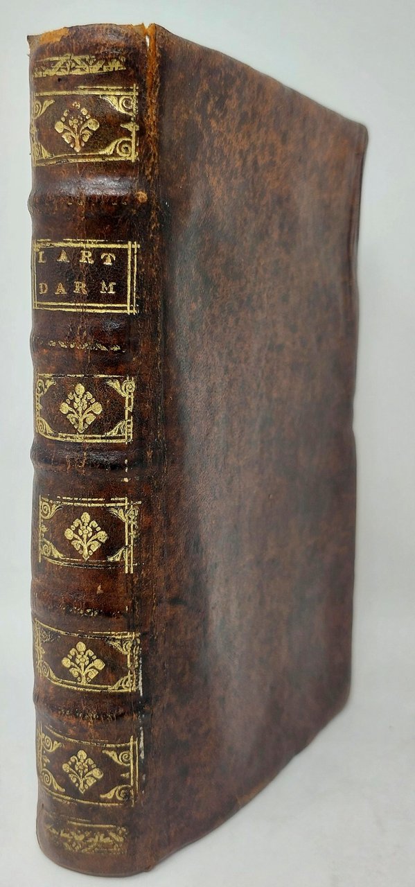 >2 opere in 1 vol. in-8, pp. (16), 173; (2 bianche), (10), 129, (3, ultimo f. bianco), legatura coeva in pelle, fregi e titolo oro al dorso (piatto anteriore un po' imbarcato). Completo, alla prima opera, di 12 tavole f.t. raffiguranti 24 scene di duello realizzate da J. Simonin, testatine, finalini e vignette ai titoli. Assieme di due trattati di scherma, raramente apparsi sul mercato. 1) Fondamentale trattato, apparso per la prima volta nel 1690 a Tolosa con titolo "L'art de l'espée". "Ce traité est un de ceux qui ont contribué à établir la supériorité de l'Ecole française... ce petit livre de Labat est, au point de vue technique, un des plus sérieux de cette époque..." (Vigeant). "Labat's two works, although of unpretending dimensions, rank among the soundest treatises on practical fencing. Indeed, from the days of Liancour and Labat till quite the latter part of the eighteenth century, all the books written by the followers of the French school are more or less close imitations of their works." (Castle). 2) Ampia panoramica di questioni affrontata in forma dialogica tra allievo e maestro: "Dans ce petit questionnaire, l'auteur prouve une fois de plus sa connaissance parfaite de son art et les soins qu'il apportait à son enseignement."(Vigeant). Buon esemplare, lievissime fioriture della carta. Alle sguardie e al primo frontesp. antiche note di possesso. 1) Pardoel 1417; En Garde 42; 2) Pardoel 1418; Ad 1 and 2: Thimm p. 156f; Vigeant p. 76f; Castle, Schools and masters of fence p. XLI and p.152ff.