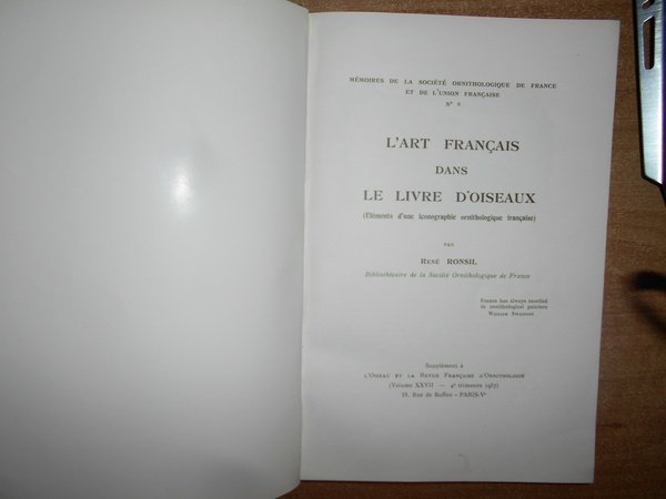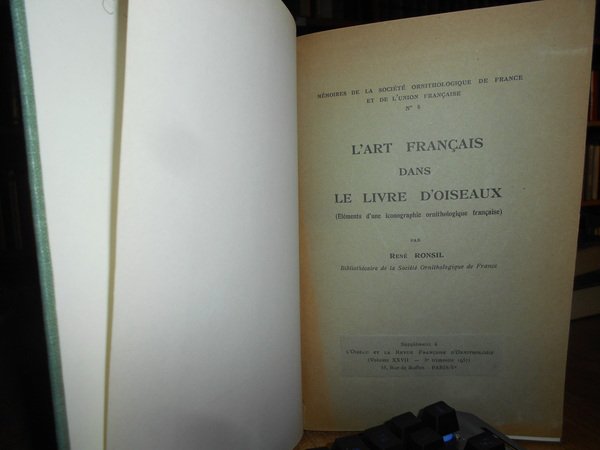 René Ronsil. Paris, Pierre André, 1957. L' Art Français dans le Livre d' Oiseaux (Eléments d' une iconographie ornithologique française). In-8°, tela verde con titolo in oro entro tassello al dorso, copertine originali conservate. 136 pp. con alcune illustrazioni n.t. e XX tavole la maggior parte in bianco e nero fuori testo. Bell' esemplare in legatura artigianale anni '70 co le copertine originali conservate. Uff. C - II - 1