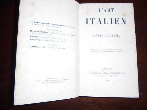 PARIS, GIRAUD, 1854. In 16∞: pp. XXIII + 388. Leg. t. tela edit. guasta. Fioriture. Dall`indice: L`ideal Italien, Origines, Dante, la passion de l`Italie. La Fresque, L`art italien au XIV sicle. La democratie dans l`art, l`art italien au XV sicle Masaccio, Mantegna. Transition du XV au XVI siecle. Leonard de Vinci. Raphael. Michel-Ange. La regeneration de l`art. Les venitiens. La decadence.