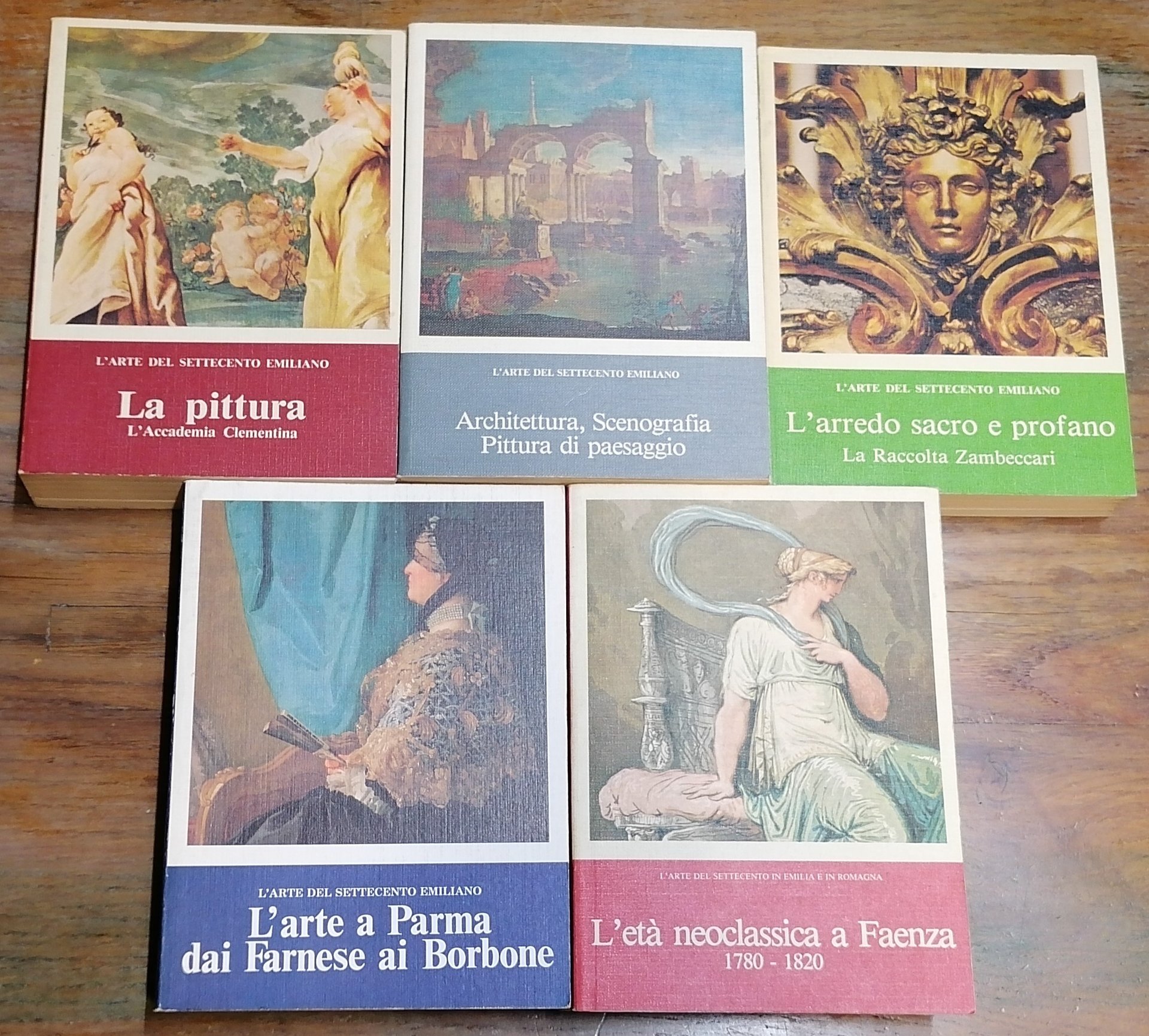 Cinque grossi volumi in 8°, brossure editoriali illustrate a colori. La serie completa dei cataloghi critici della rassegna articolata su cinque sedi nelle città di Bologna, Parma e Faenza, a cura dell' Ente Manifestazioni Artistiche di Bologna e dedicata all' Arte del Settecento in Emilia e in Romagna. Imponente apparato di studio e documentazione realizzato dalle Edizioni Alfa con il contributo di oltre cinquanta collaboratori scientifici. "La pittura. L' Accademia Clementina", 1979, pp. XLVIII,580 di cui 243 con 412 ill. in b/n. "Architettura, Scenografia. Pittura di paesaggio", 1980, pp. XVI,600 di cui 248 con 362 ill. in b/n. "L' arredo sacro e profano a Bologna e nelle Legazioni pontificie", 1979, pp. XVI,480 di cui 236 con 354 ill. in b/n. "L' arte a Parma dai Farnese ai Borbone", 1979, pp. XVI,498 di cui 238 con 381 ill. in b/n. "L' età neoclassica a Faenza 1780-1820", 1979, pp. LXIV,544 di cui 262 con 418 ill. in b/n. Tutti i volumi in ottimo stato di conservazione.