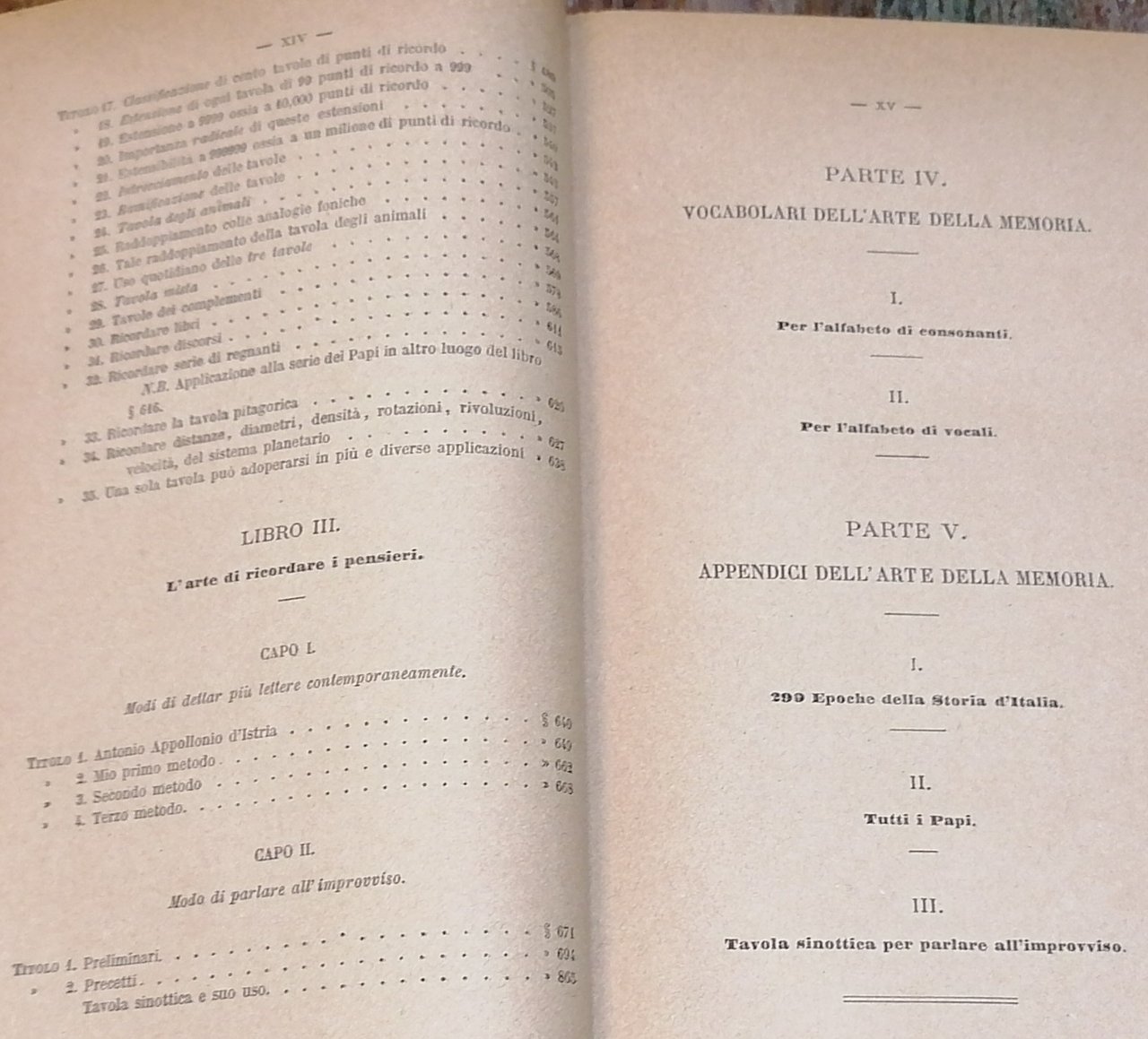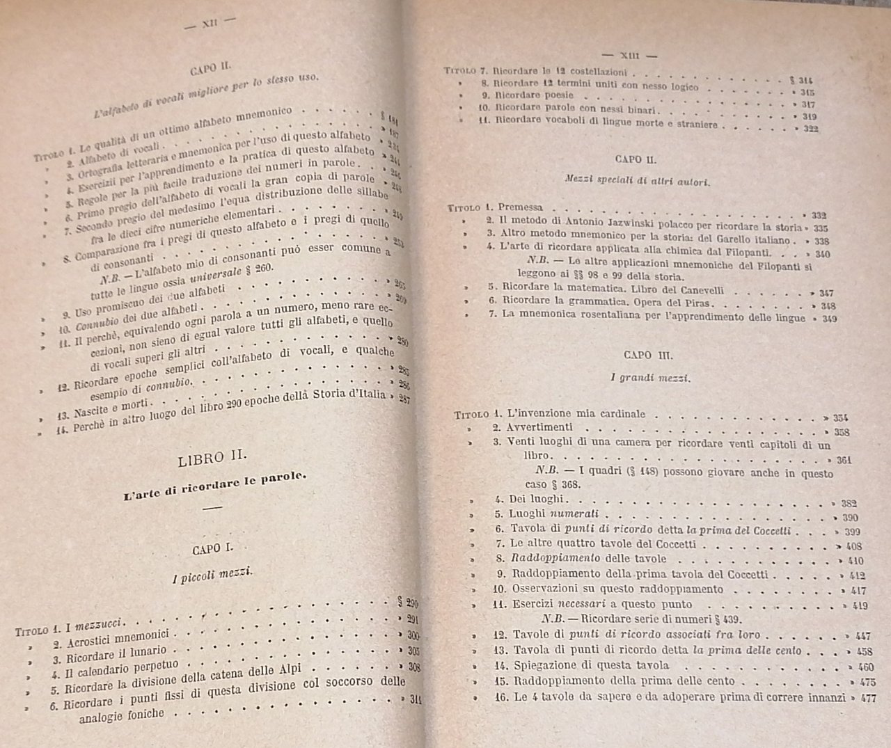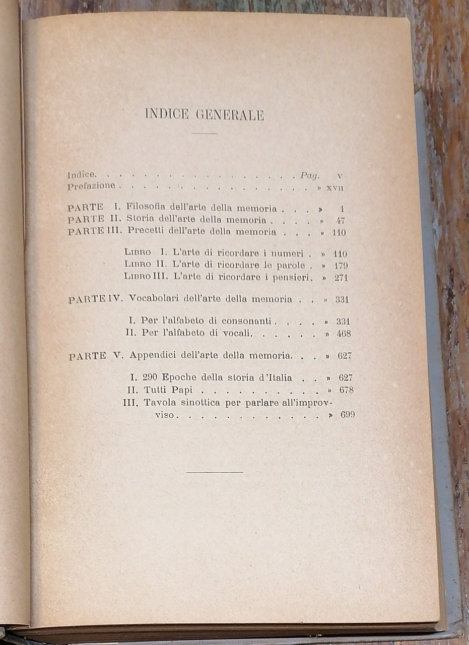 (Mnemotecnica) In 8°, legatura editoriale in piena tela grigia con titoli e fregi in nero, pp. XXIV,698,(2), con 4 tavole ripiegate fuori testo (Tavola di 99 punti di ricordo ; La tavola degli animali ; La tavola mista ; Tavola sinottica per parlare all'improvviso). Seconda edizione. Dorso lievemente scolorito, ingiallimento uniforme della carta, peraltro stato di conservazione molto buono.