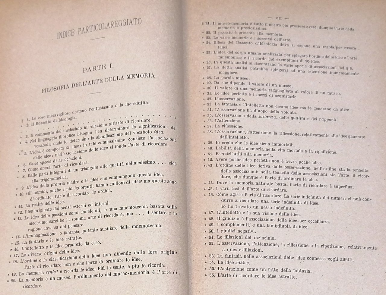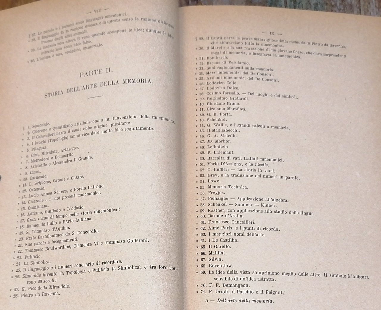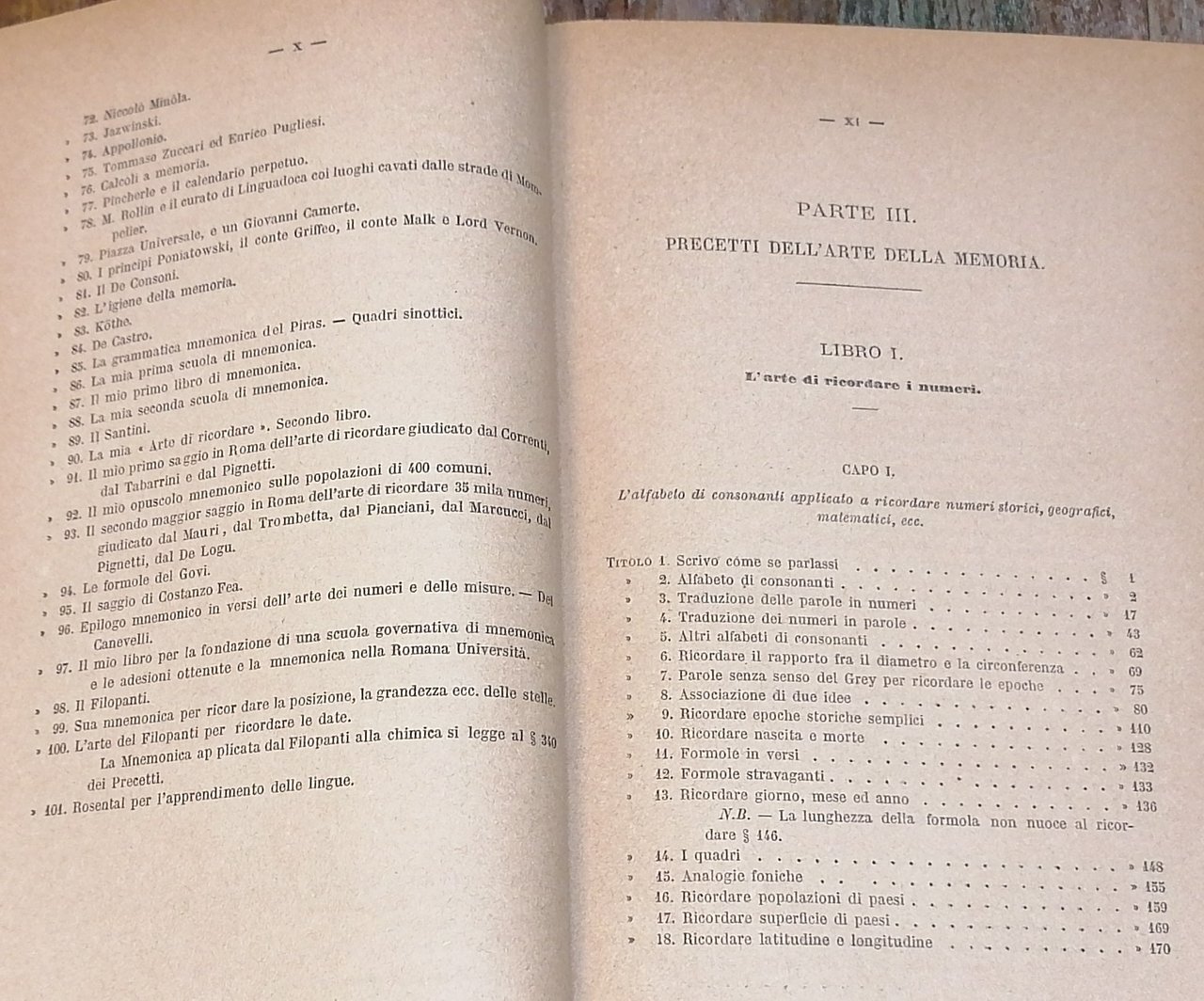 (Mnemotecnica) In 8°, legatura editoriale in piena tela grigia con titoli e fregi in nero, pp. XXIV,698,(2), con 4 tavole ripiegate fuori testo (Tavola di 99 punti di ricordo ; La tavola degli animali ; La tavola mista ; Tavola sinottica per parlare all'improvviso). Seconda edizione. Dorso lievemente scolorito, ingiallimento uniforme della carta, peraltro stato di conservazione molto buono.