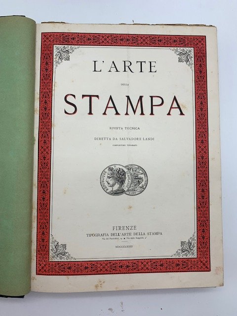 Raccolta degli anni X - XII (1880 - 82) per un totale di 24 numeri (mancano i nn. 62 e 65 dell' anno XII). In 4, cm 24,5 x 33, pp. 4 + da 305 a 576 con molte tavole fuori testo anche ripiegate, inserti con esempi e pezzi di bravura tipografici, campionari di caratteri ecc. Testimonianza del lavoro di Salvatore Landi, forse uno dei maggiori teorici della tipografia del XIX secolo, si adopero' al fine di ristabilire in Italia la perduta capacita' di realizzare lavori a stampa degni di predecessori come il Bodoni, Manuzio ecc. . Del suo gusto risentirono le pubblicazioni del Sommaruga mentre suo allievo fu Raffaello Bertieri. Tra l'altro occorre ricordare che il Landi fu lo stampatore della prima edizione di uno dei testi fondamentali del XIXo secolo in Italia: La scienza in cucina dell'Artusi. Le tematiche trattate nella vanno dalla storia dell'arte della stampa, all'analisi di nuove tecniche tipografiche ecc. Gran parte dei campionari di caratteri presentati sono opera della Fonderia Alessandri mentre i lavori di composizione sono della tipografia del Landi. Tra le grandi tavole presenti possiamo citare: Alfabeto campestre (campionario di caratteri incorniciati da scene bucoliche); Bordure grecque; Zierschrift Pretiosa (Fonderie J.G. Schelter & Giesecke Lipsia); Catalogo di alcune edizioni (Tipografia dell'arte della stampa); F. Orsenigo. Fabbricante d'inchiostri da stampa ( grande tavola raffigurante lo stabilimento di V. Moscova a Milano) ecc.
