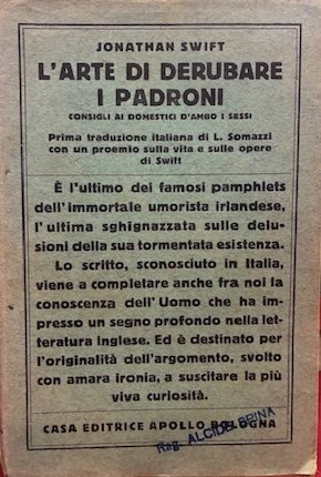 L’arte di derubare i padroni. Consigli ai domestici d’ambo i sessi. Prima traduzione italiana di Luigi Somazzi con una nota sulla vita e le opere di Swift