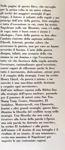 Nelle pagine di questo libro, che raccoglie per la prima volta in un unico volume gli scritti dei maggiori strateghi d'ogni tempo, il lettore si imbatte nelle regole e nei principi dell'arte della guerra. Arte semplice e tutta d'esecuzione in cui, come ha scritto Napoleone nelle sue Massime, «non c'è nulla di vago; tutto è buon senso e niente è ideologia», l'arte della guerra va ben oltre l'ambito ristretto della sapienza militare. Filosofi, letterati, persino coloro che avversano la guerra, non per caso ne hanno avvertito il fascino. L'arte della guerra disegna, infatti, uno scenario della vita umana in cui domina e vige l'eccezione, tutto ciò che fuoriesce dalla regola astratta. Governare, razionalizzare quest'eccezione, essere capaci di riflessione anche là dove tutto è movimento, dislocazione, azione pura è il compito della strategia. Come ha scritto Henry Lloyd, «la guerra è azione, e un esercito è una macchina mobile destinata a eseguire ogni movimento». Dall'arte militare esposta nella Bibbia fino alla strategia dell'epoca nucleare, passando per il pensiero di autori come Sun Tzu, Shang Yang, Cesare, Onosandro, El Andalusy, Montecuccoli, von Clausewitz, Jomini e altri grandi strateghi, questo libro illumina la filosofia del conflitto insita nella strategia. Una filosofia che non esita a ricorrere alla forza della parola («Spesso una sola parola ha distrutto un esercito», ha scritto El Andalusy) o alla grazia dell'istante («II destino di una battaglia è il risultato di un istante, di una intuizione», recita una massima di Napoleone) per imporre le sue contrastate ragioni.