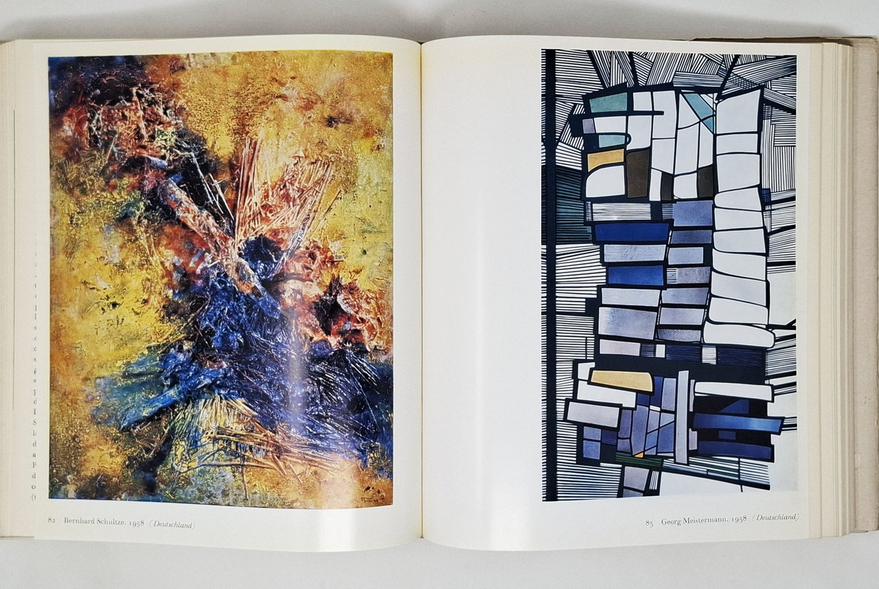 60 tavole a colori, 120 in bianco e nero. L'edizione italiana è stata curata da Angelica Comello. Prima edizione: aprile 1959. Pagine: 380. Formato: 22 x 25,5 cm circa. Stato di conservazione: strappetti e qualche abrasione sui bordi della sovraccoperta, un piccolo pezzetto di nastro adesivo trasparente sul bordo inferiore della sovraccoperta posteriore, leggere pieghe sul margine superiore dell'ultima pagina ma, nel complesso, un buon esemplare. Interno molto buono. Privo di firme di appartenenza, sottolineature, annotazioni o altri segni nel testo. Copertina editoriale cartonata rigida, con sovraccoperta a colori. 'Molto è stato scritto intorno alla pittura dell'ultimo decennio e ai risultati conseguiti nei vari paesi, al di qua e al di là dell'Oceano, ma nessuno ancora ce ne aveva dato un panorama d'insieme. Per questo coraggioso tentativo, l'editore e il noto critico tedesco Will Grohmann, curatore del volume, si sono valsi per i testi e per la scelta delle illustrazioni, della collaborazione di più critici, i quali conoscono la pittura del loro paese per essersene occupati a lungo e intensamente: Marcel Brion per la Francia, Charles Bernard per il Belgio, Carlo Giulio Argan e Nello Ponente per l'Italia, Otto Bihalji-Merin per l'Iugoslavia e la Polonia, lo stesso Grohmann per la Germania, Austria e Svizzera, Herbert Read per l'Inghilterra, H.L.C. Jaffé per i Paesi Bassi, J.P. Hodin per la Scandinavia, Sam Hunter per USA e Canada, e infine - per la Spagna - un critico italiano, Umbro Apollonio, particolarmente informatosull'arte di quella nazione'.
