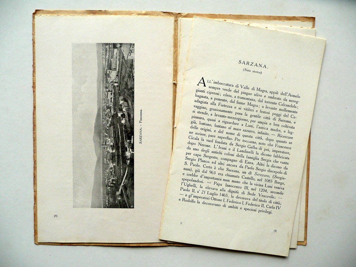 Ferdinando Podestà, L'Arte in Sarzana Illustrazioni e note Stabilimento Tipografico S. Giuseppe, Firenze, s. d. (ma 1915 circa); cm 20x12, pp. 44 con varie ill. quasi tutte fotogr. in b/n fuori t.; brossura ed. con fregi a colori e in oro alla br. ant. Dorso con tracce di vecchia etichetta applicata. Prima e ultima pagina bianca con timbretto del precedente proprietario. Condizioni di conservazione Esemplare in buone condizioni con tracce d'uso; brossure con alcune piccole leggere bruniture. Pagine ben conservate con allentamento delle cuciture dei fascicoli (vedi foto). Interessante pubblicazione sulla storia di Sarzana, con varie illustrazioni quasi tutte fotografiche in bianco e nero fuori testo. OPEB.2607 N