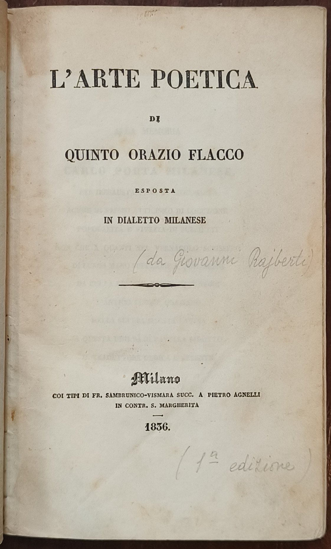 Quinto Orazio Flacco, Giovanni Rajberti, L'arte poetica esposta in dialetto milanese, Milano, Tipi di Fr. Sambrunico Vismara, 1836