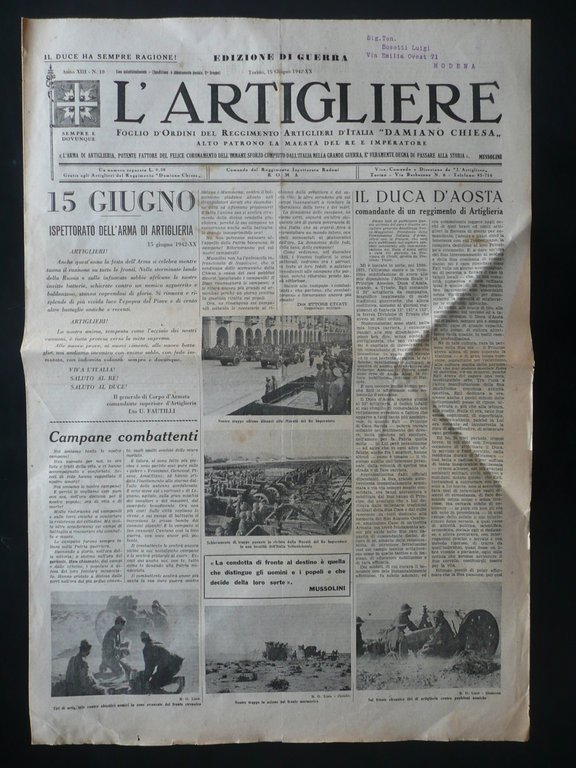Giornale, L'Artigliere" Foglio d'Ordini del Reggimento Artiglieri d'Italia "Damiano Chiesa" Anno XIII - Numero 10 Torino, 15 giugno 1942 - Edizione di Guerra Torino 1942, cm 49,5x35, pp. 4 (bifolio) con alcune ill. fot. in b/n n.t., numero completo. Margine sup. della prima pagina con timbretto recante il nome del precedente proprietario. Condizioni di conservazione Esemplare in buone condizioni con tracce d'uso, normali pieghe di conservazione, qualche piccola lieve brunitura, alcuni margini con minimi strappetti, margini est. con lievi tracce di pieghe. Varie illustrazioni fotografiche in bianco e nero nel testo. Numero completo. SC03.D9956 N "